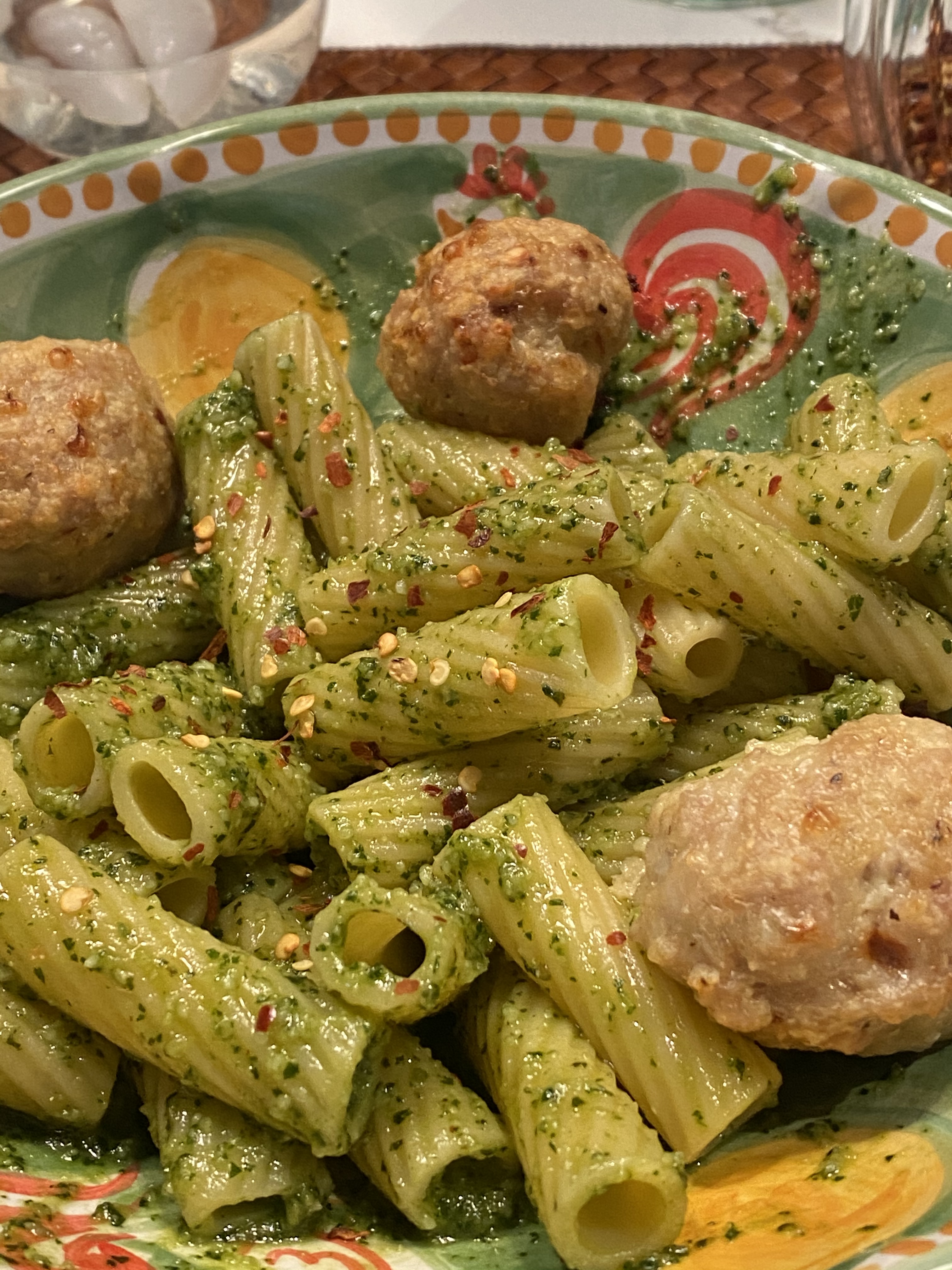 I love meatballs — all kinds of meatballs and these were just delicious. I made with Basil Pesto Pasta and it was just perfect. You can also drop these into any red sauce for a delicious meal. They are very easy to make and we ate some and I stored the rest in the freezer for the next time.