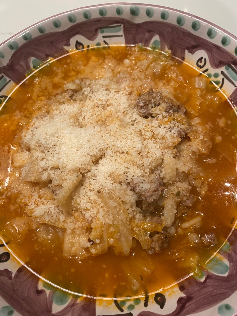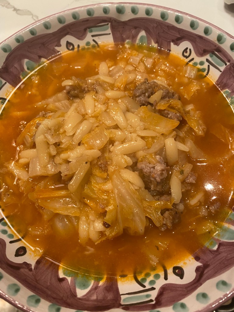 This is one of those delicious easy to make super comforting soups. Of course I may have lost some of you with the Cabbage and if you hate it you hate it but if you’re willing to give it a shot this is a super cozy kind of soup which we can all use a little bit of these days. Made this for Joel and I and had 2 quarts left over for 2 more meals. Perfect dinner served with a nice green salad . I used pork sausage because that’s what I had in the house feel free to use chicken or turkey sausage whatever works best for you. I used a spicy italian pork sausage . I also used a frilly-edged Napa Cabbage . This cabbage is nice and soft and breaks down quickly . If using regular green cabbage you’ll have to cook a bit longer — probably another 15 minutes or so. Of course you can be flexible with your pasta , I used orzo but you can use any small pasta such as ditalini, mini elbows or mini farfalla .