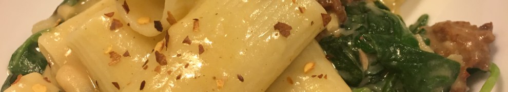 I love pasta and am always on the lookout for new and delicious ways to prepare it. This recipe is the real deal and reminded me of many a pasta dish I enjoyed in Italy. If Joel liked greens more I would have added more kale and as it is he always wonders why I contaminate the pasta with all the beans and green stuff. If I were making for myself I would have added more kale or whatever greens you like. It’s not the most simple recipe as it has a few steps but thoroughly worth the effort involved. I loved the way the beans gave it so much flavor. I used Paccheri Pasta — I was able to pick up a homemade version of this pasta. It’s just a smooth, giant rigatoni with thinner walls . It soaked up the beans and broth ! I used a can of cannelinni beans but almost any white bean will do. I used Italian spicy sausage but you can try spicy lamb sausage as well or any sausage you would like.