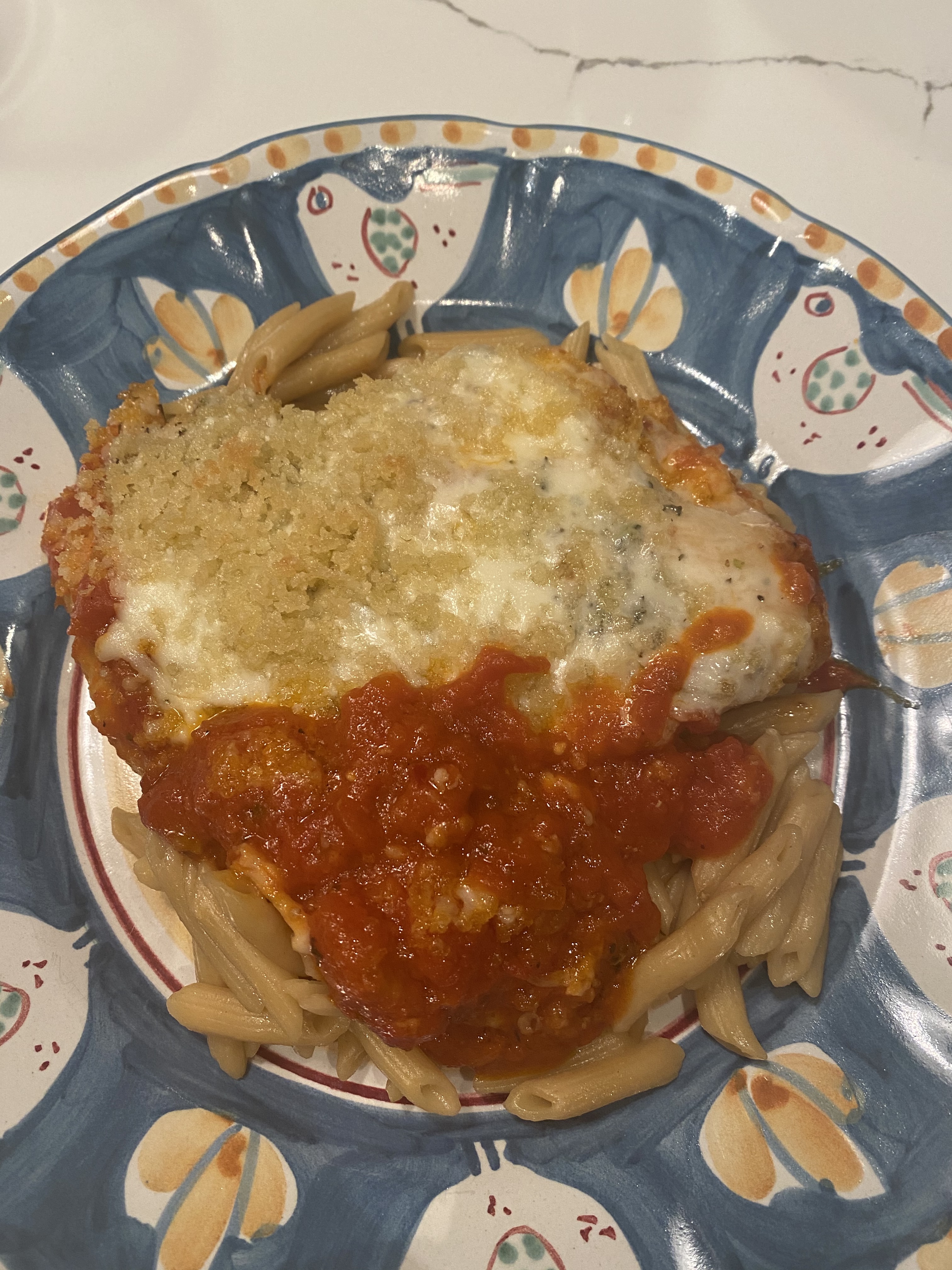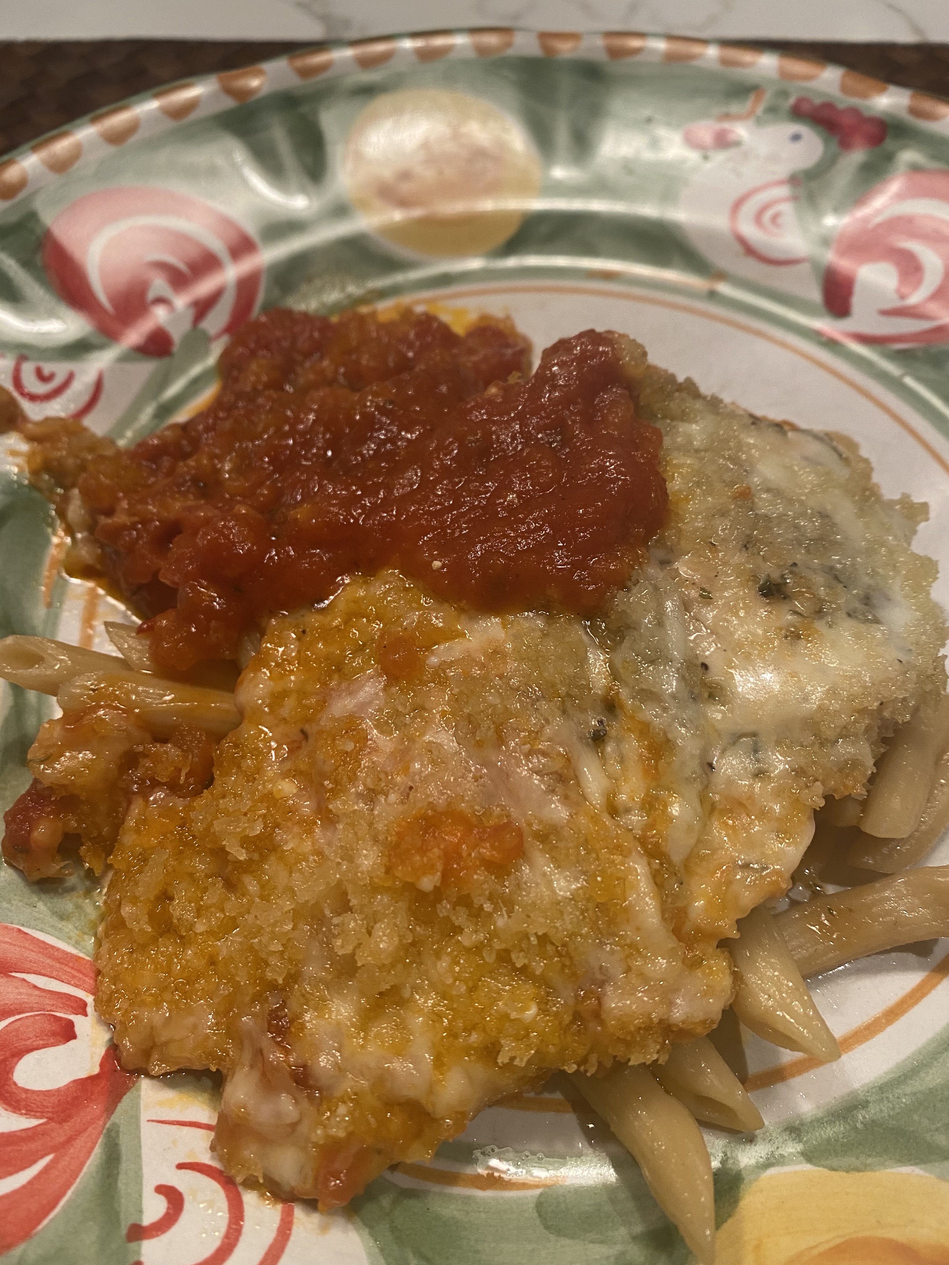 I usually have home-made tomato sauce in the freezer but since there was no planning on my part I used Raos Arrabiata Sauce which I love and always have on hand. ( their Marinara is also a house staple) I used regular Panko Bread Crumbs because I didn’t have the Italian flavored ones in the house ( and it was perfect) For Pasta I used whatever I had in the house and felt like having , spaghetti would be perfect or any macaroni type. I used Penne this time but any pasta will do or no pasta if you prefer. A vegetable would be fine here as well. We had a green salad and the chicken and we were both pretty happy with the results.