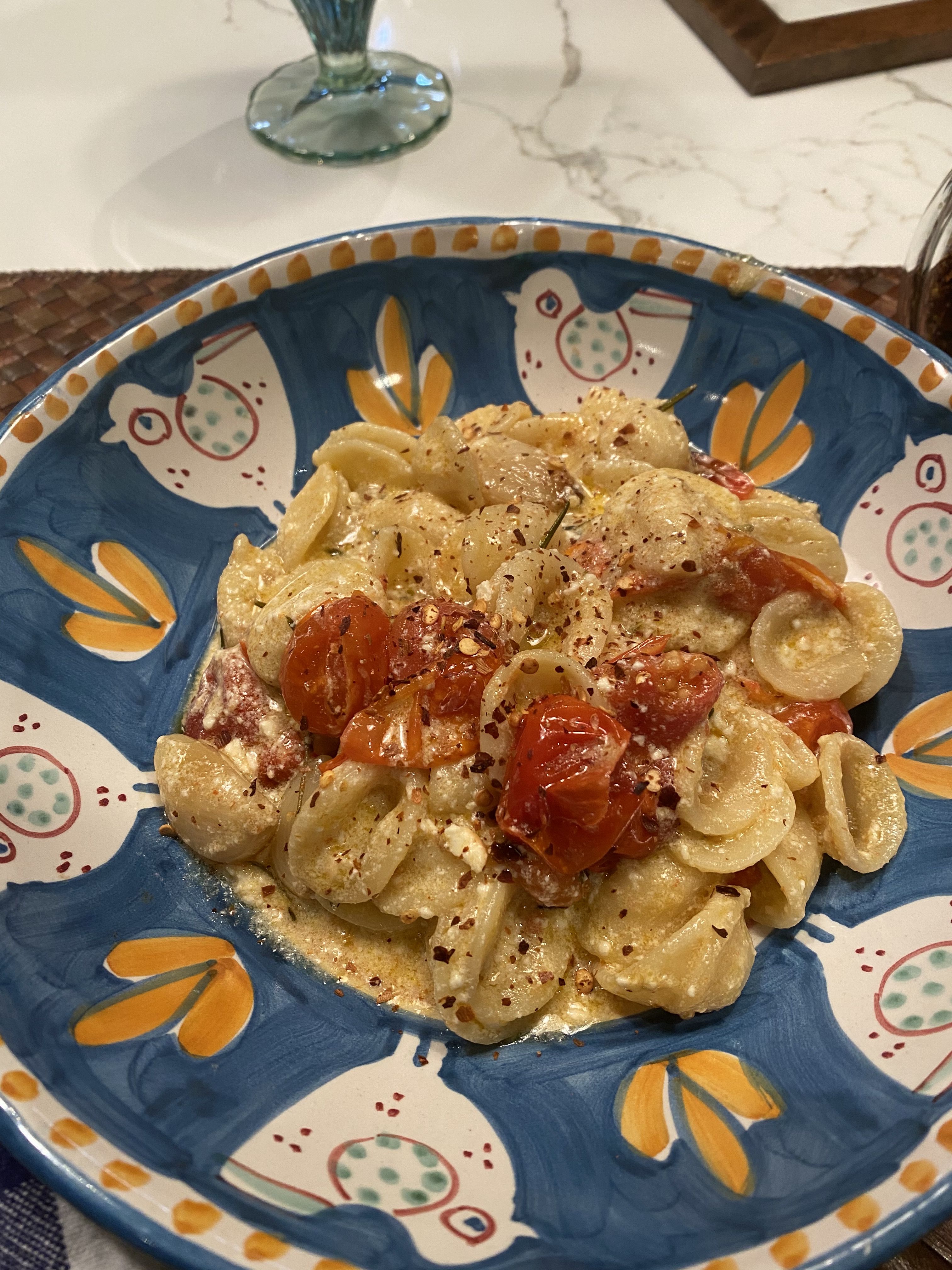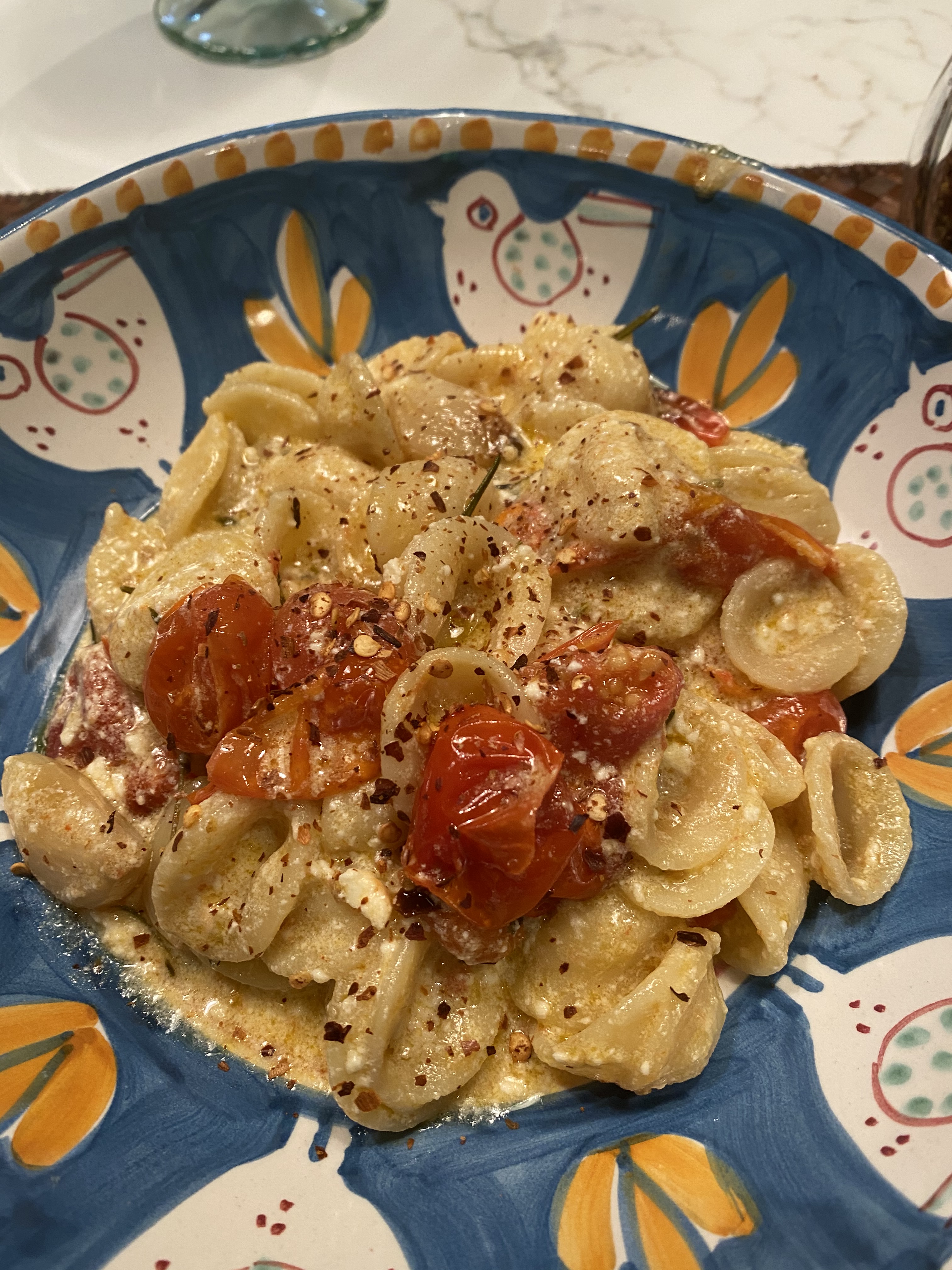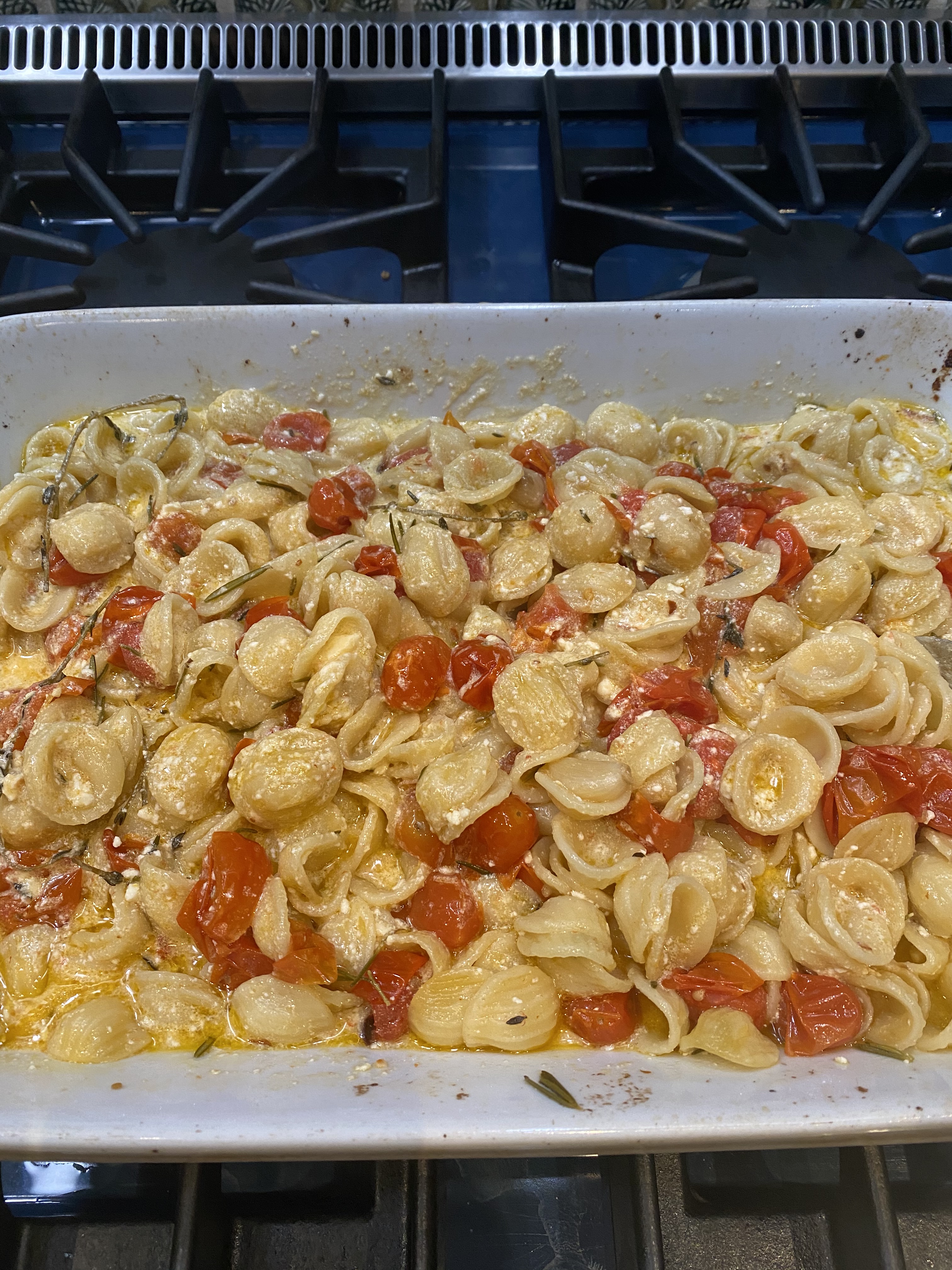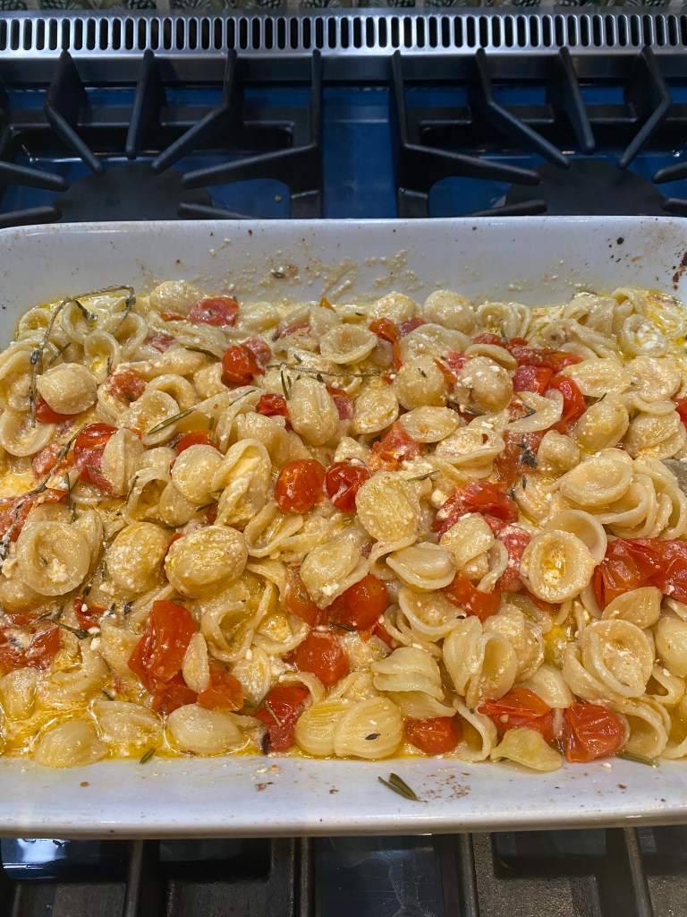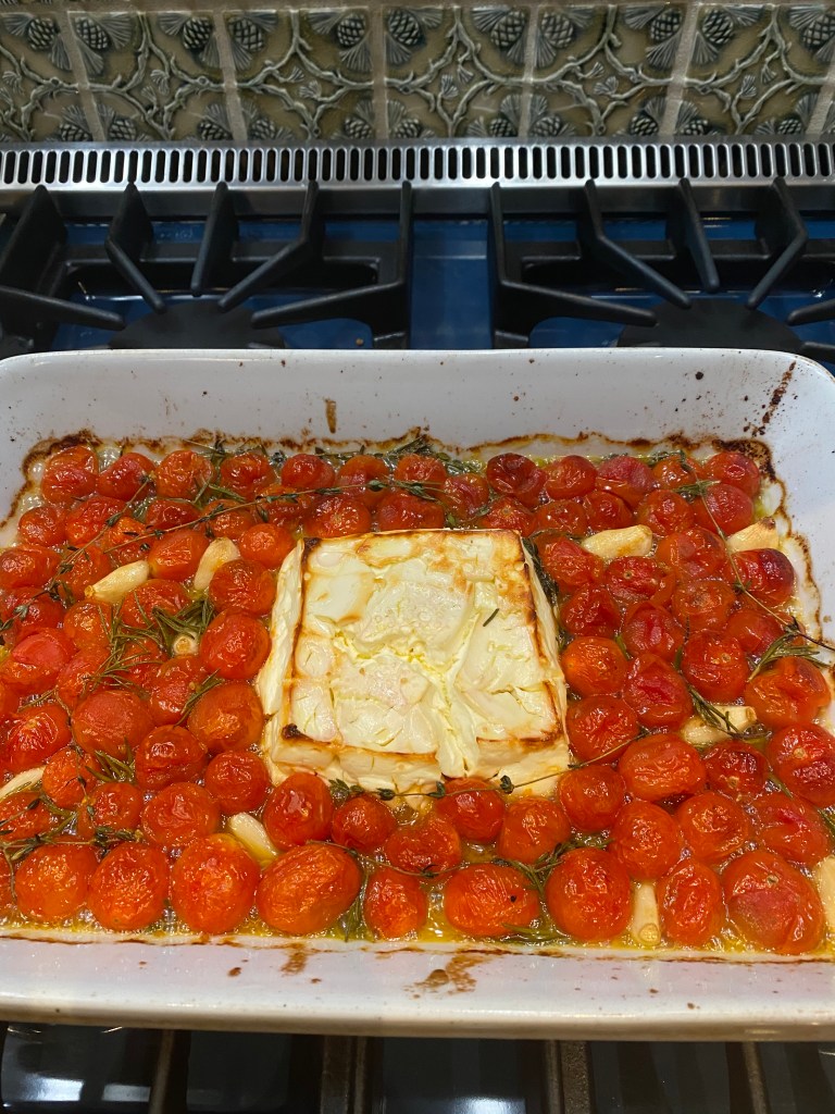 This recipe has hit the internet and gone viral to the point that you can’t find a block of feta in the market. The reaction has been crazy. There are many versions of this recipe and I chose to go with Melissa Clark’s version because I think she’s just one of the best chefs out there and hers was the one pot version which is always a win win in my book. It couldn’t possibly be easier to make and ingredients are usually readily available, I had to hit 3 stores to find the feta ! Assuming you can get the feta this is a wonderful recipe and Joel gave it a 10. Perfectly vegetarian and perfectly yummy.