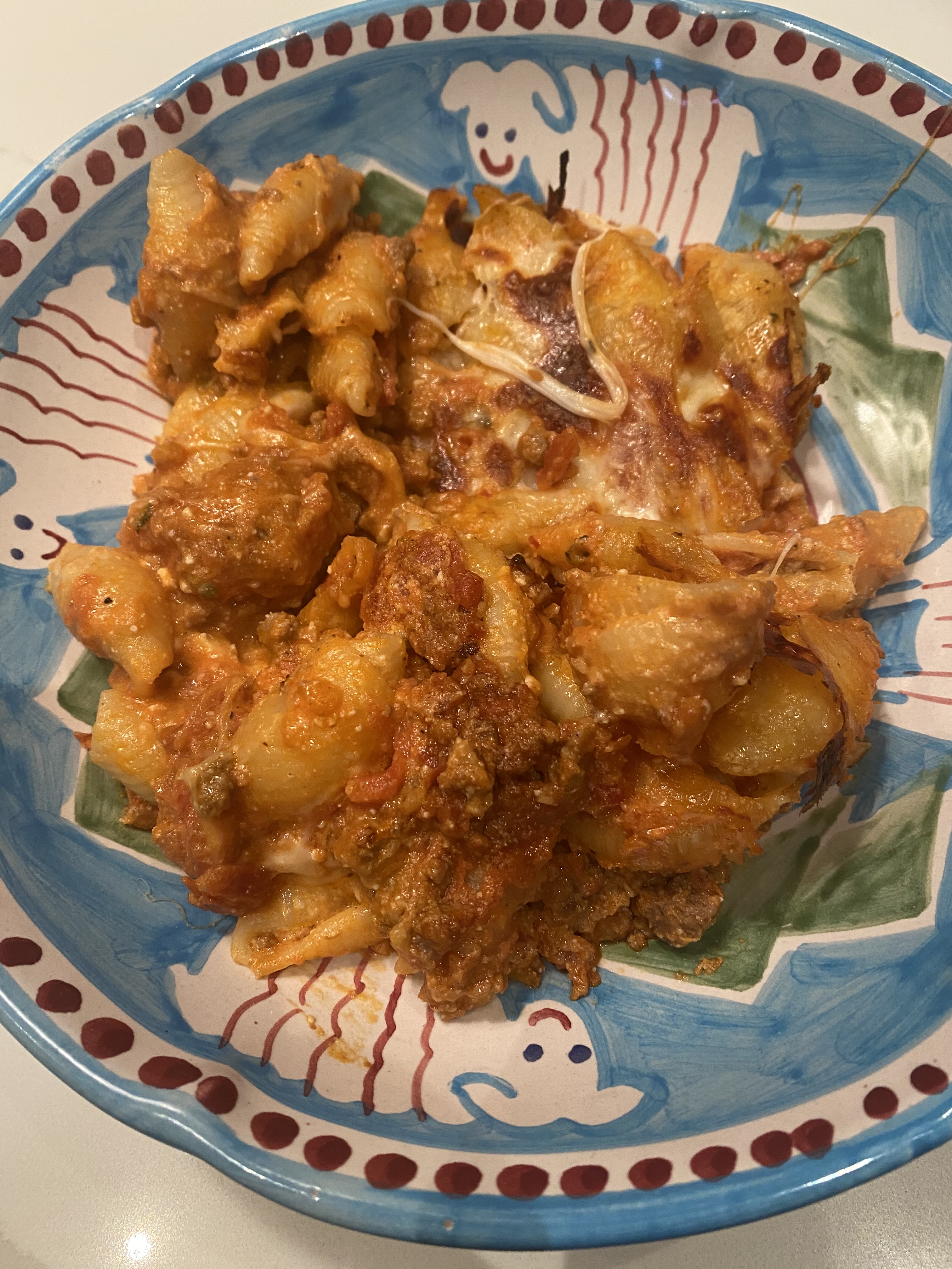 While I really love stuffed shells ( see recipe ) sometimes I just don’t feel like futzing with stuffing those big shells. This was delicious and had all the flavor of the stuffed shells I usually make without all the work. This is a great family meal and made as is should serve 6-8 depending on your eaters and what else you serve with it. No hassle and delicious and of course you can substitute ground turkey or ground chicken , I like ground beef and use the 85/15 version because I like a little fat in the sauce but lean ground beef is fine. Turkey can be very dry so try and get dark meat or at least 85/15 .