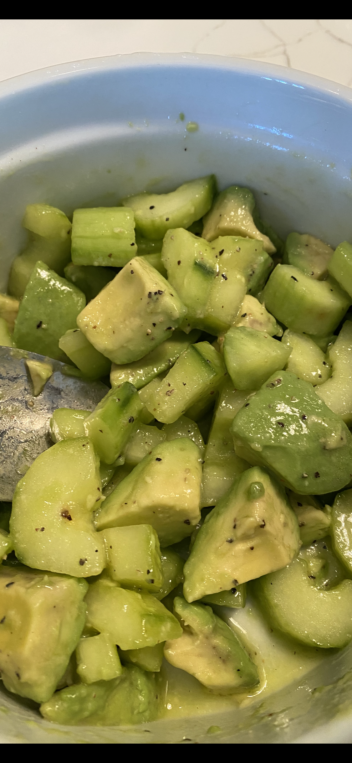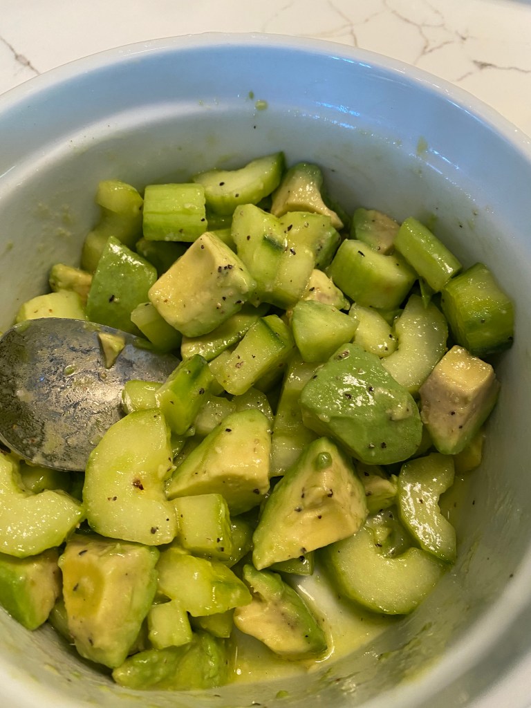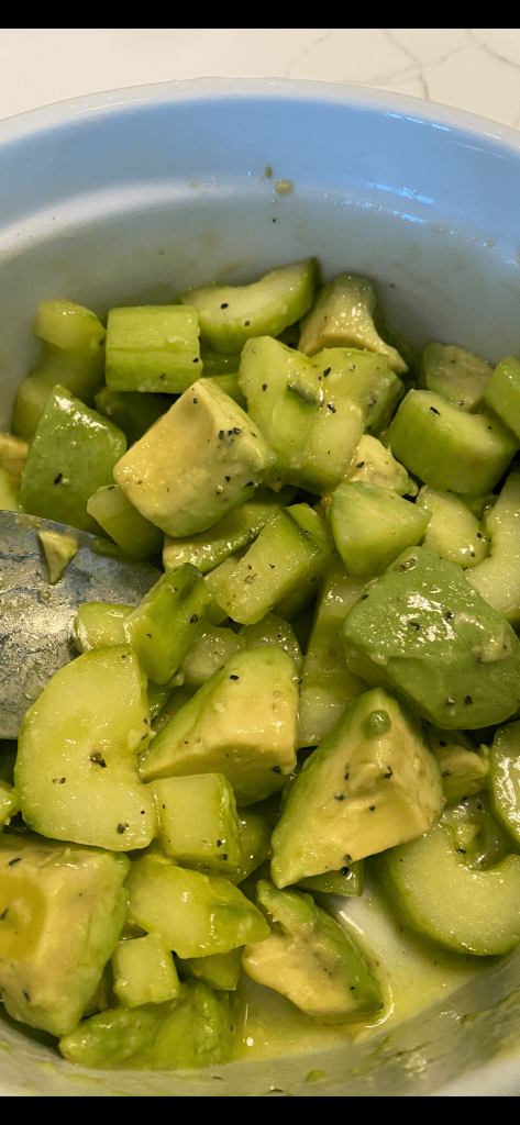 In a medium sized salad type bowl, combine sliced cucumbers , avocado and if you’re adding green onions.