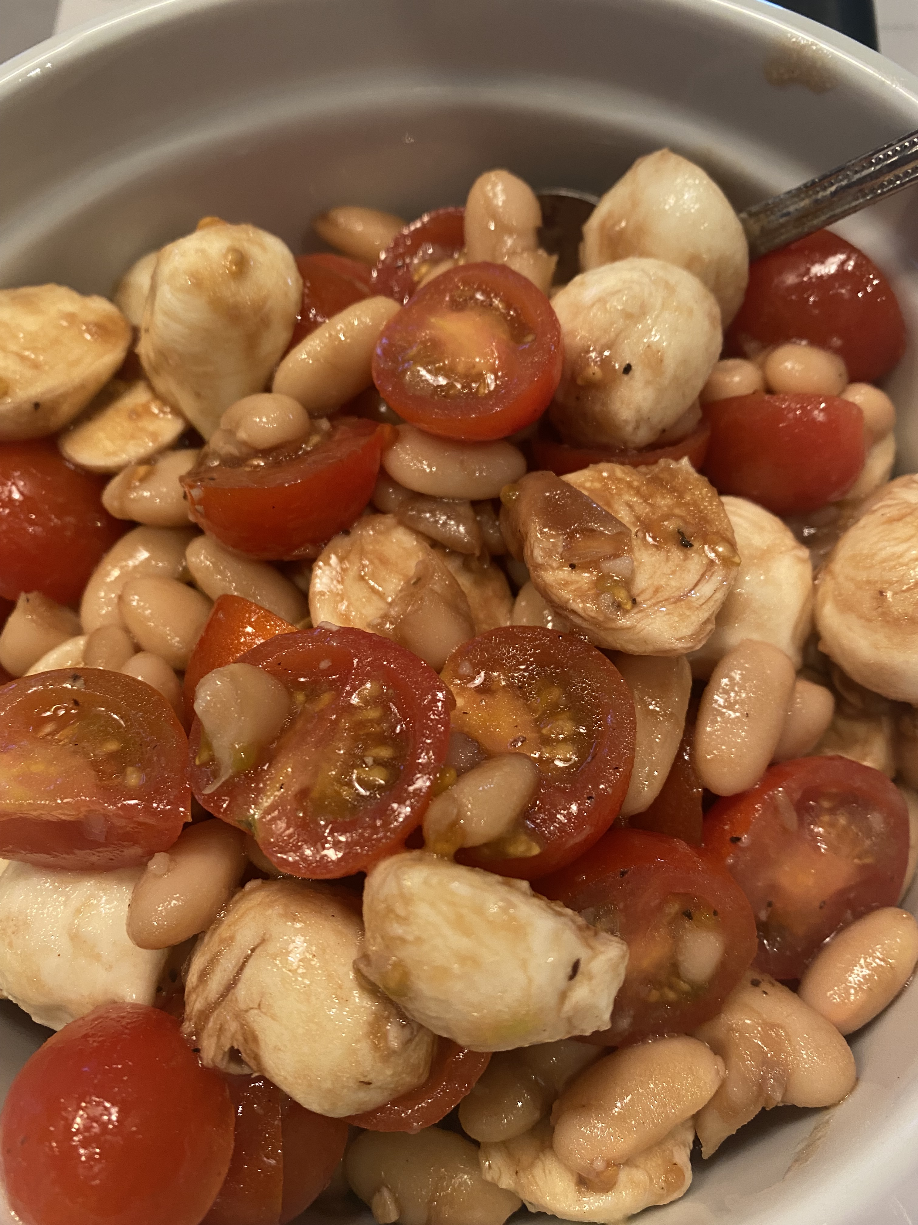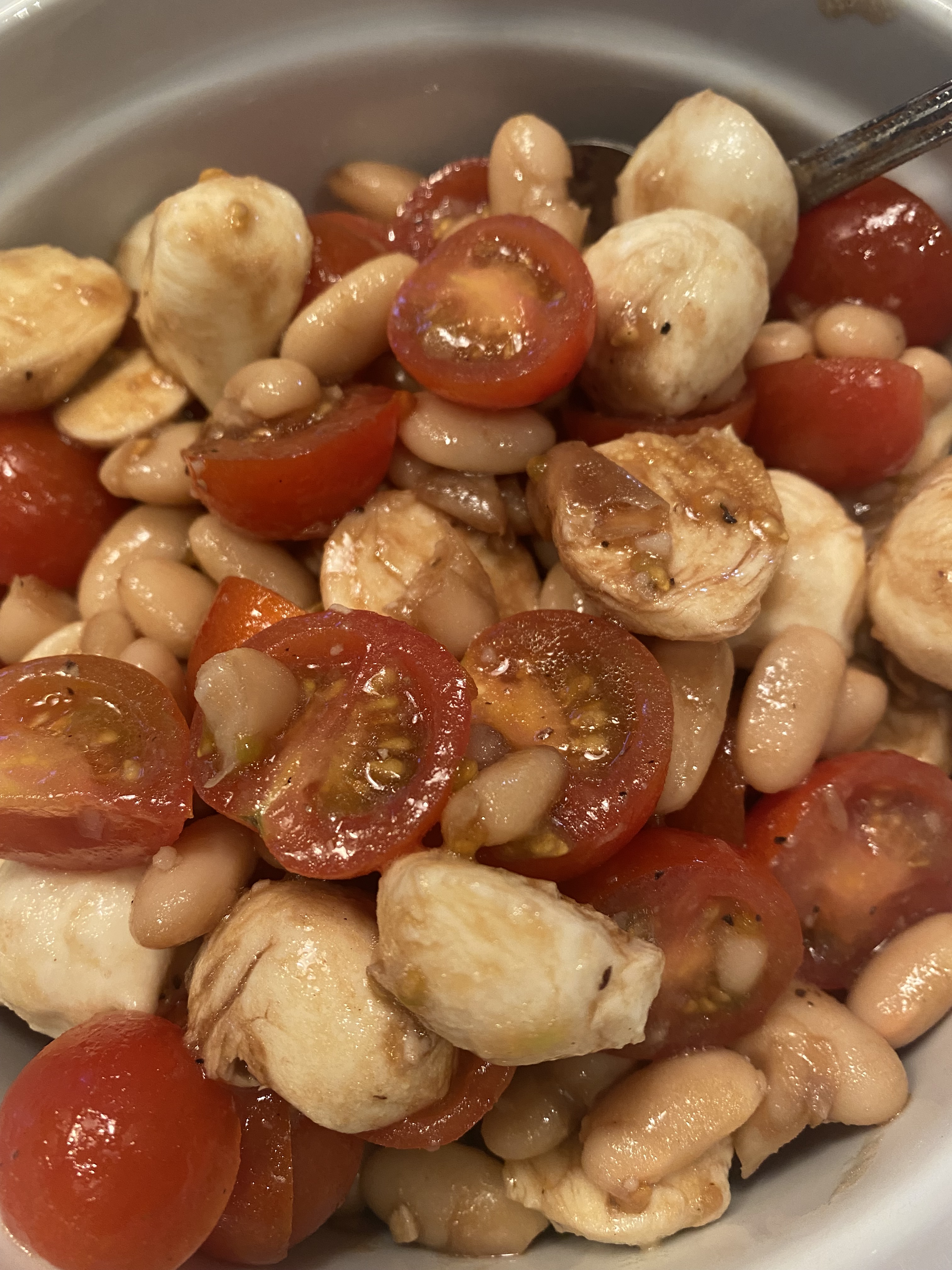 An easy side salad for the lazy hazy last days of Summer and really good anytime of the year. White Beans from the can which is always in my pantry works to make this an easy simple delicious side salad. You can add some arugula or just serve alongside any protein and it’s perfection with simple ingredients.