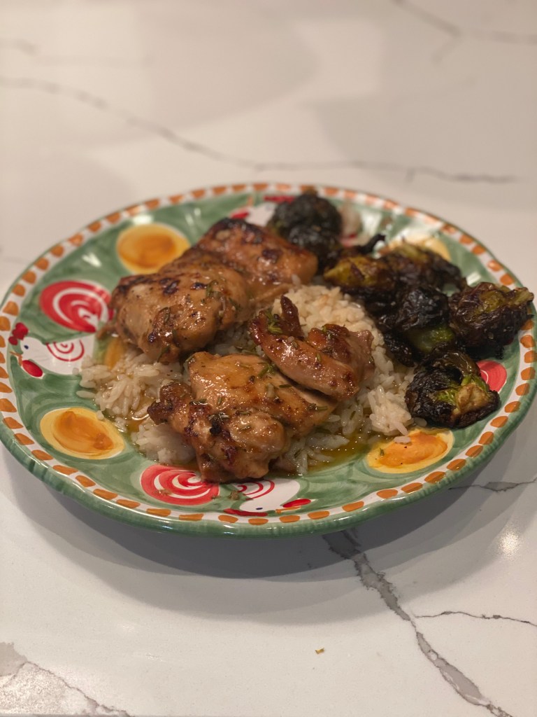Once cooked I spooned a little cooked marinade over the chicken and rice! and served with burnt brussels this time out or any vegetable will do.