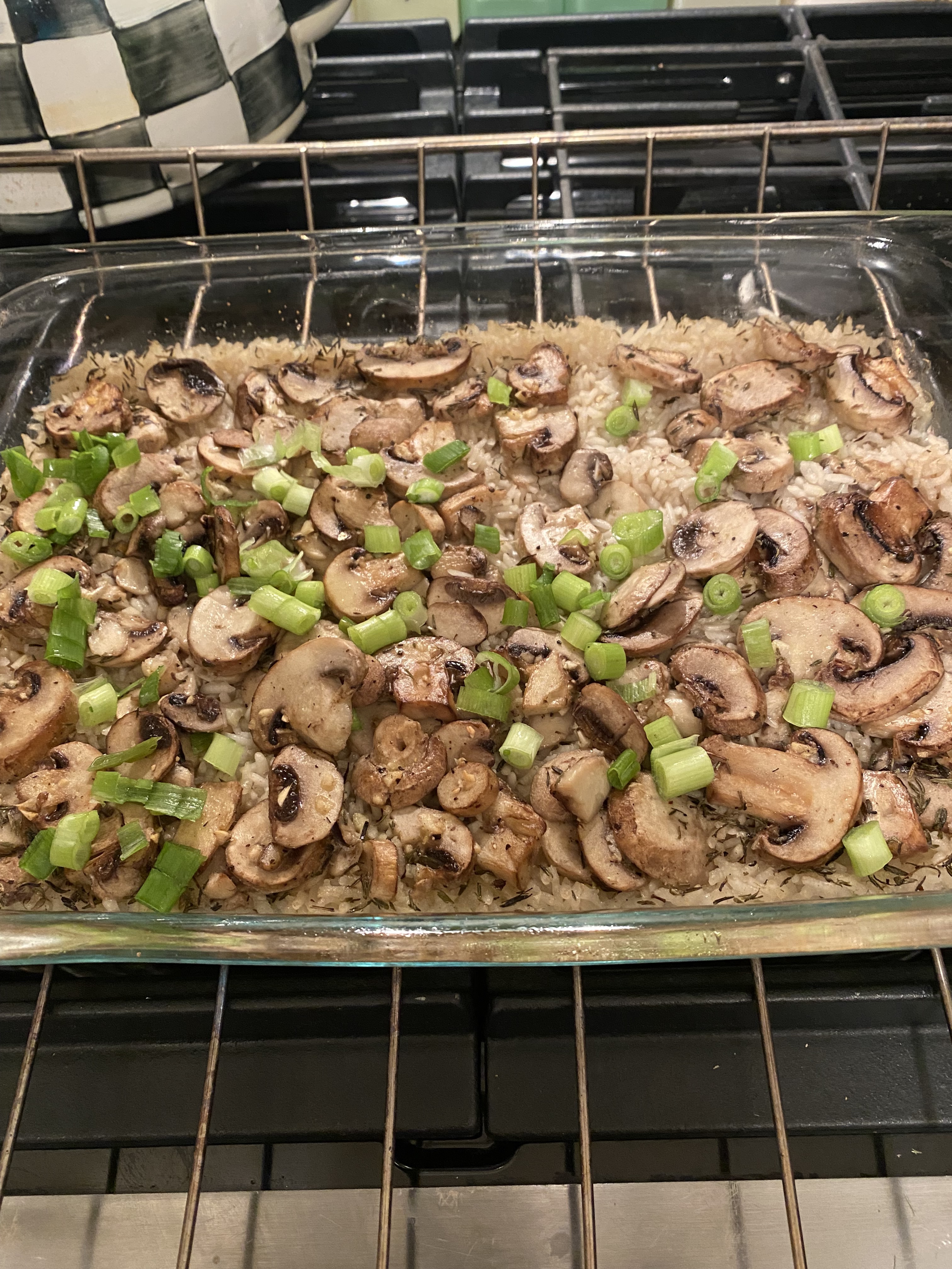 This is an oven baked rice with mushrooms which turned out so perfectly and so delicious I just had to share. The rice was garlicky , with a hint of butter and the mushrooms were golden brown and juicy. Very little prep and very few ingredients and very tasty. Perfect accompaniment to poultry or fish.