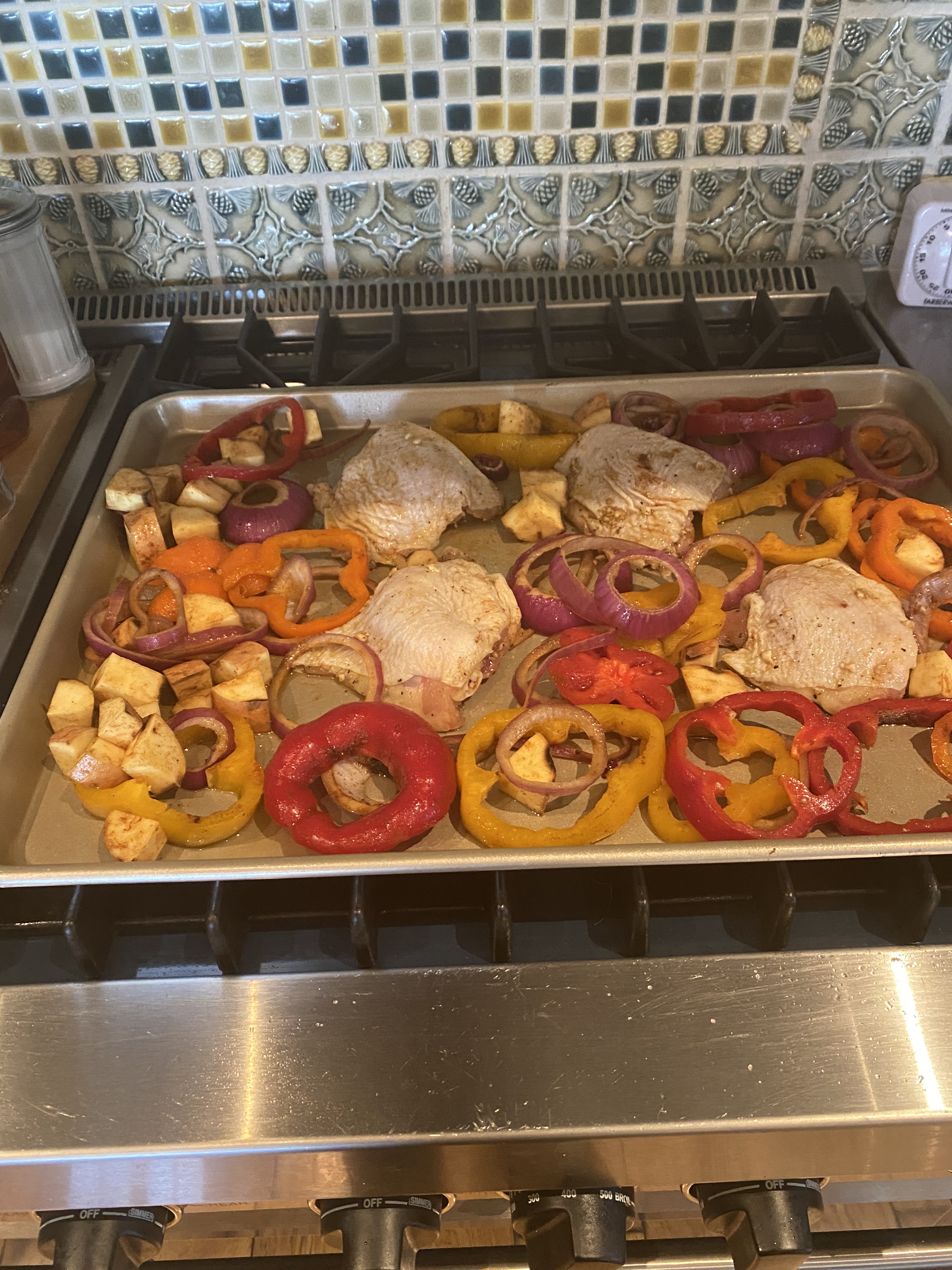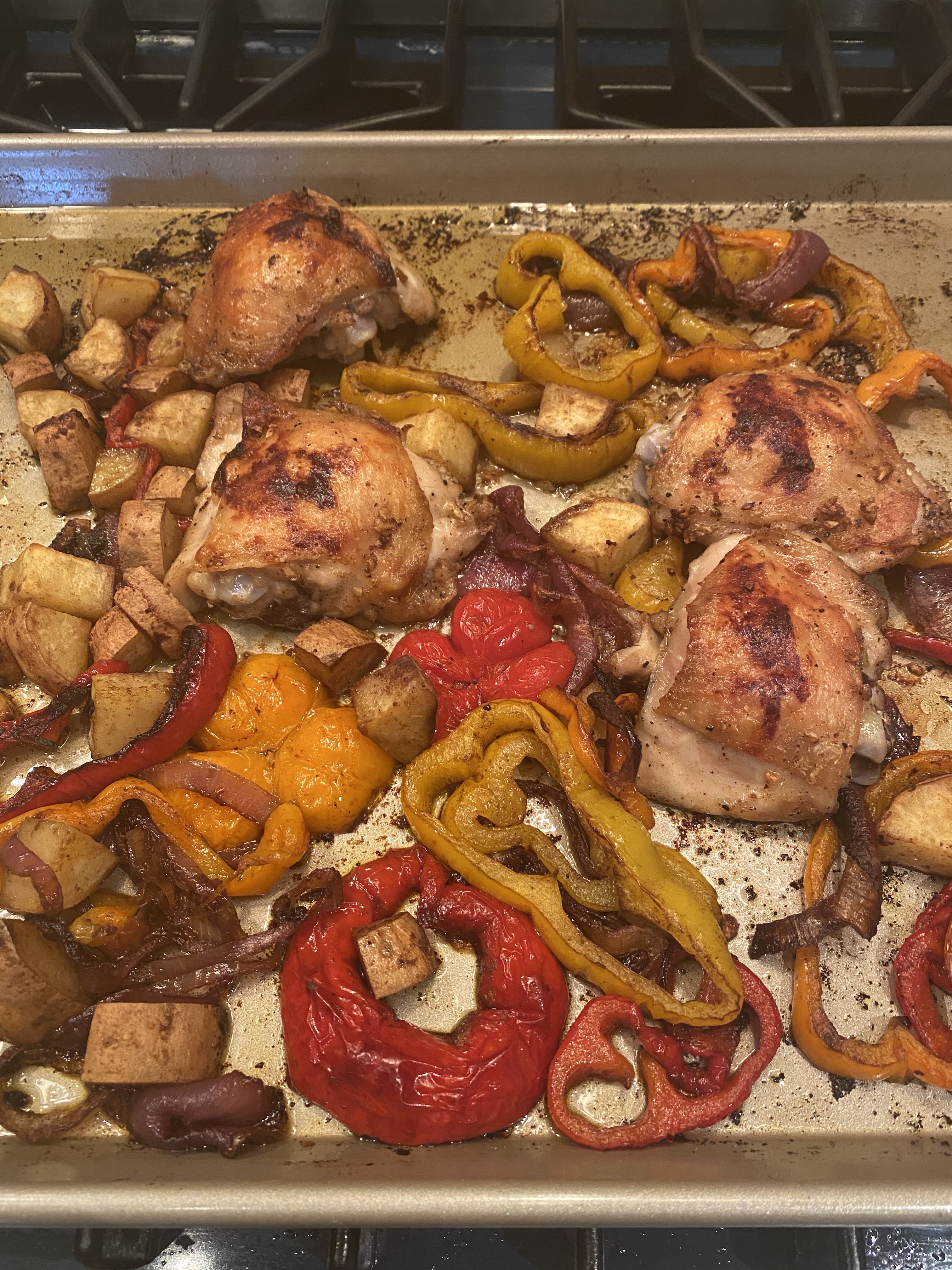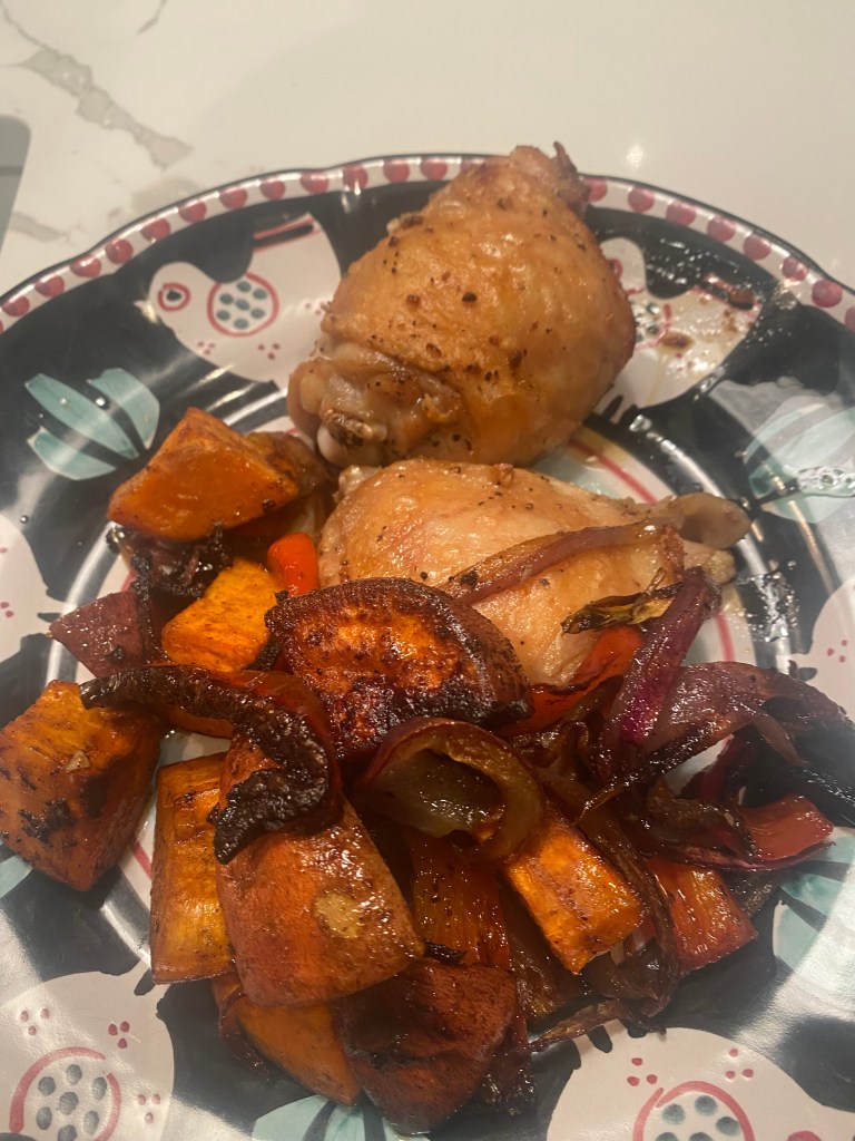 This is one of my go to recipes whenever I have some chicken thighs ( which we prefer) and sweet potatoes and peppers in the house. Pretty simple and while not the most elegant meal it’s yummy and perfection on a plate.