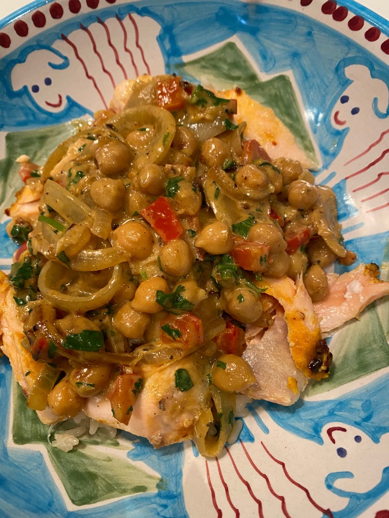 This would be most perfect served with some warm Naan Bread as well but we didn’t have any in the house so we passed on that. This recipe is for 4 people and honestly the prep was quick and cooking time was about 1/2 hour all in. I cut whole recipe in 1/2 for the two of us and had a little salmon left over which I ate cold for lunch the next day and it was outstanding.