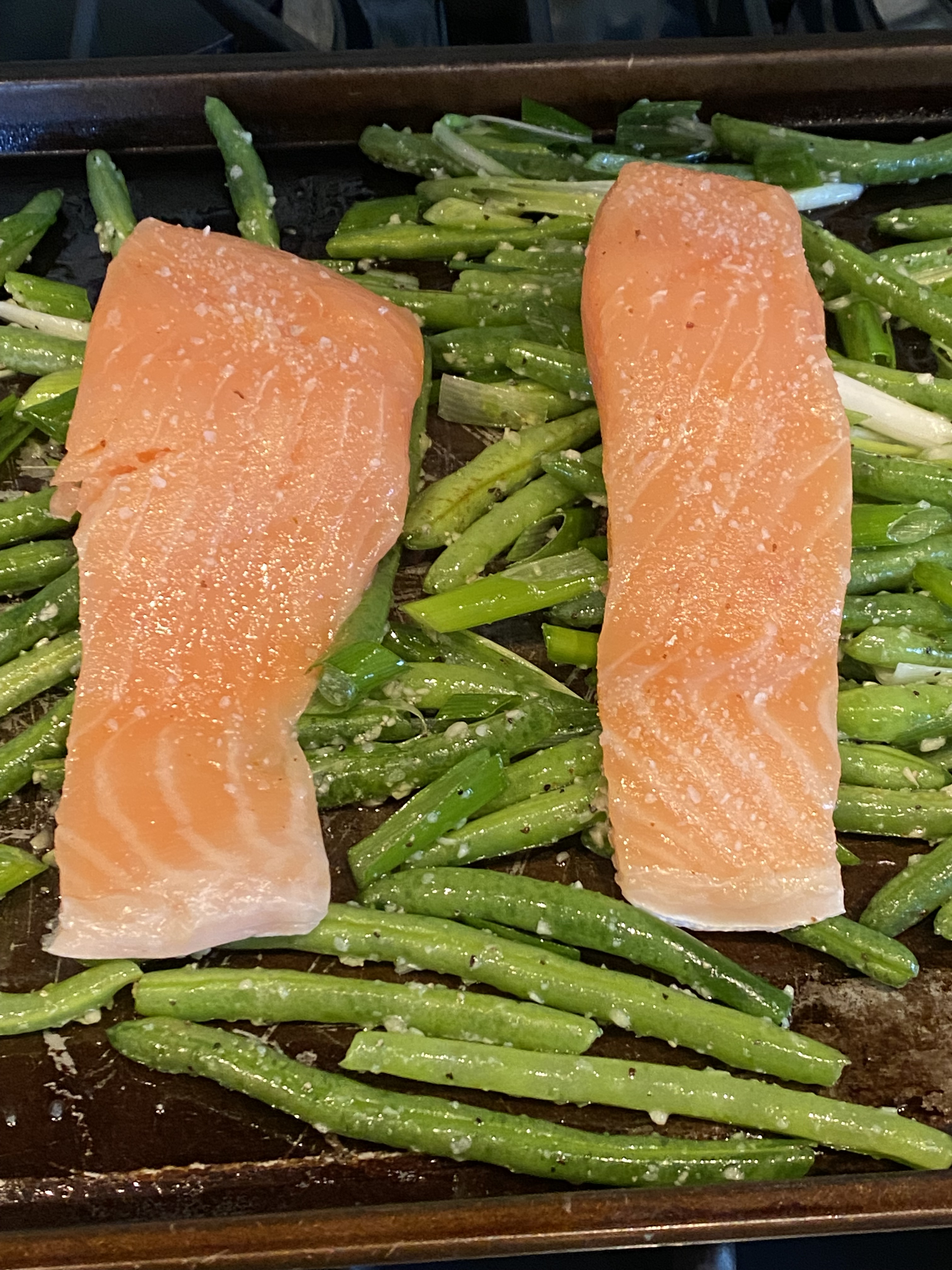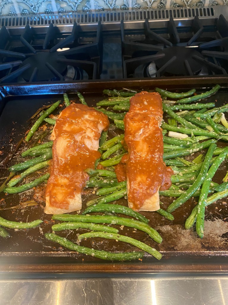Arrange Salmon on top of beans and spoon peanut butter glaze on top of the fish. Roast until salmon is cooked to medium and beans are crisp-tender. App. 5- 7 minutes depending on the thickness of your salmon. I probably didn’t use all of the glaze.