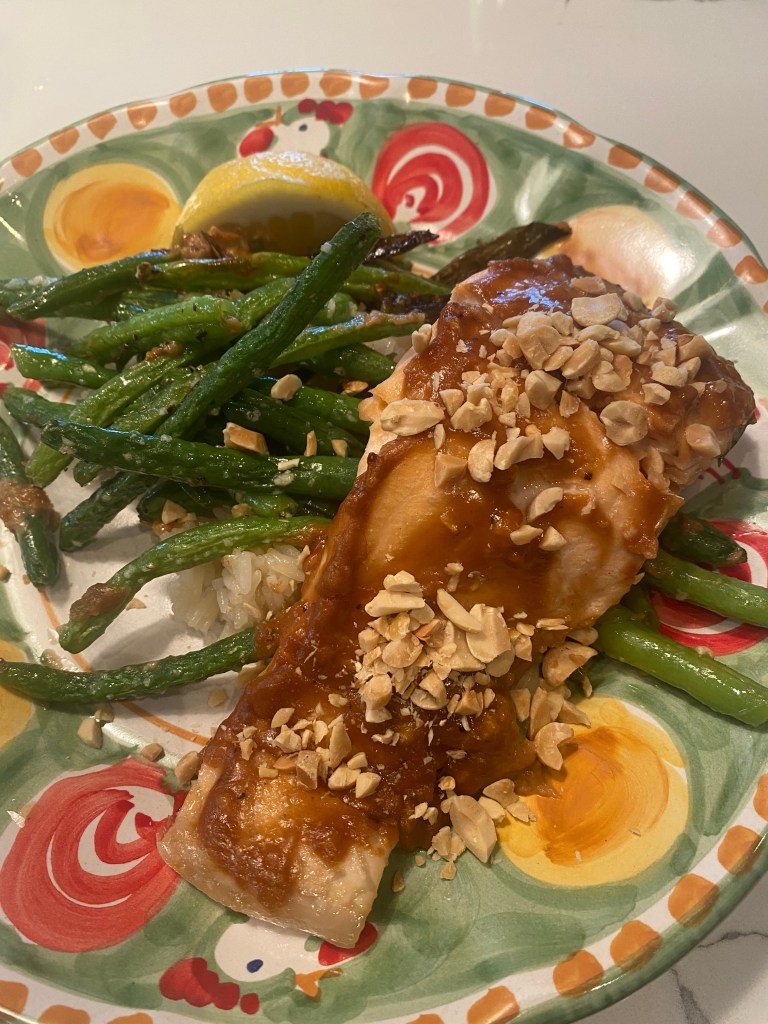 I saw this recipe in the NYT Cooking and knew I had to make it — I mean almost anything with peanut butter has my name on it. I was a little skeptical but the flavor was Thai like and the lemon juice cuts the peanut butter perfectly. Very easy recipe and very quick to prep and cook. It’s sweet and savory and you can make the glaze a day ahead and just bring it to room temperature first. We enjoyed this very much and the beans were perfect! Perfect weeknight meal.