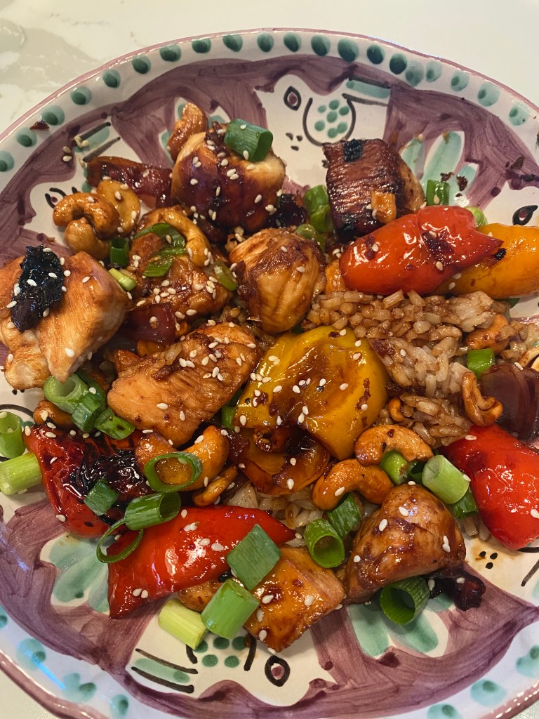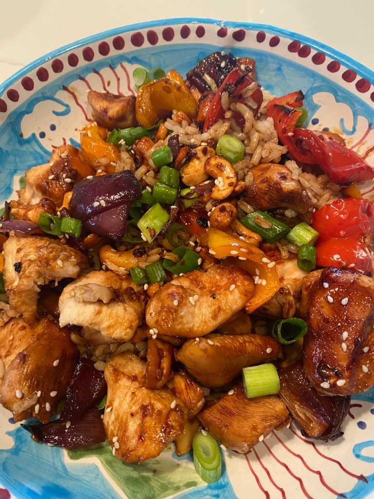 This is one of those perfect sheet pan meals easy to assemble and delicious to eat. Although I usually make this recipe on the stove-top I decided to experiment with it in the oven and all on one pan. Since I used white meat chicken breasts I cooked for about 13 minutes because you want to make sure not to dry out the chicken which is pretty easy to do. You can use dark meat chicken — thighs ( skinless and boneless ) if you prefer . I may use them next time out. Just make sure you spray the sheet pan with cooking spray and really spray or you’ll have a hell of a time cleaning that pan. It’s very tasty served over any rice you’d like or no rice , I used brown rice this time.