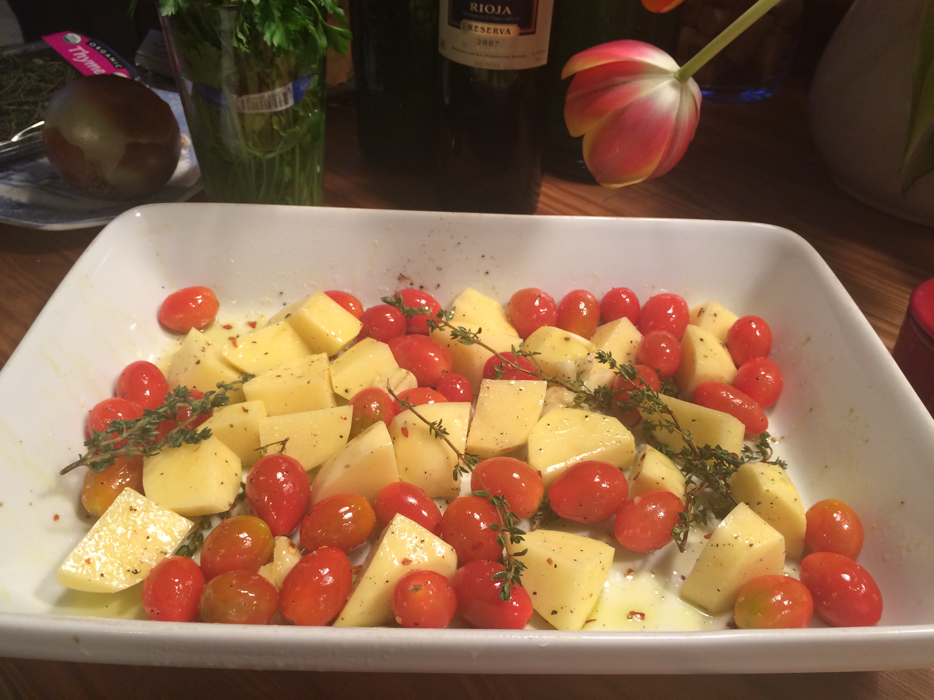 Peel the potatoes and cut up into bite size pieces. Add to the sprayed baking dish . Smash and peel the garlic. Rinse the tomatoes and add as well along with the thyme.