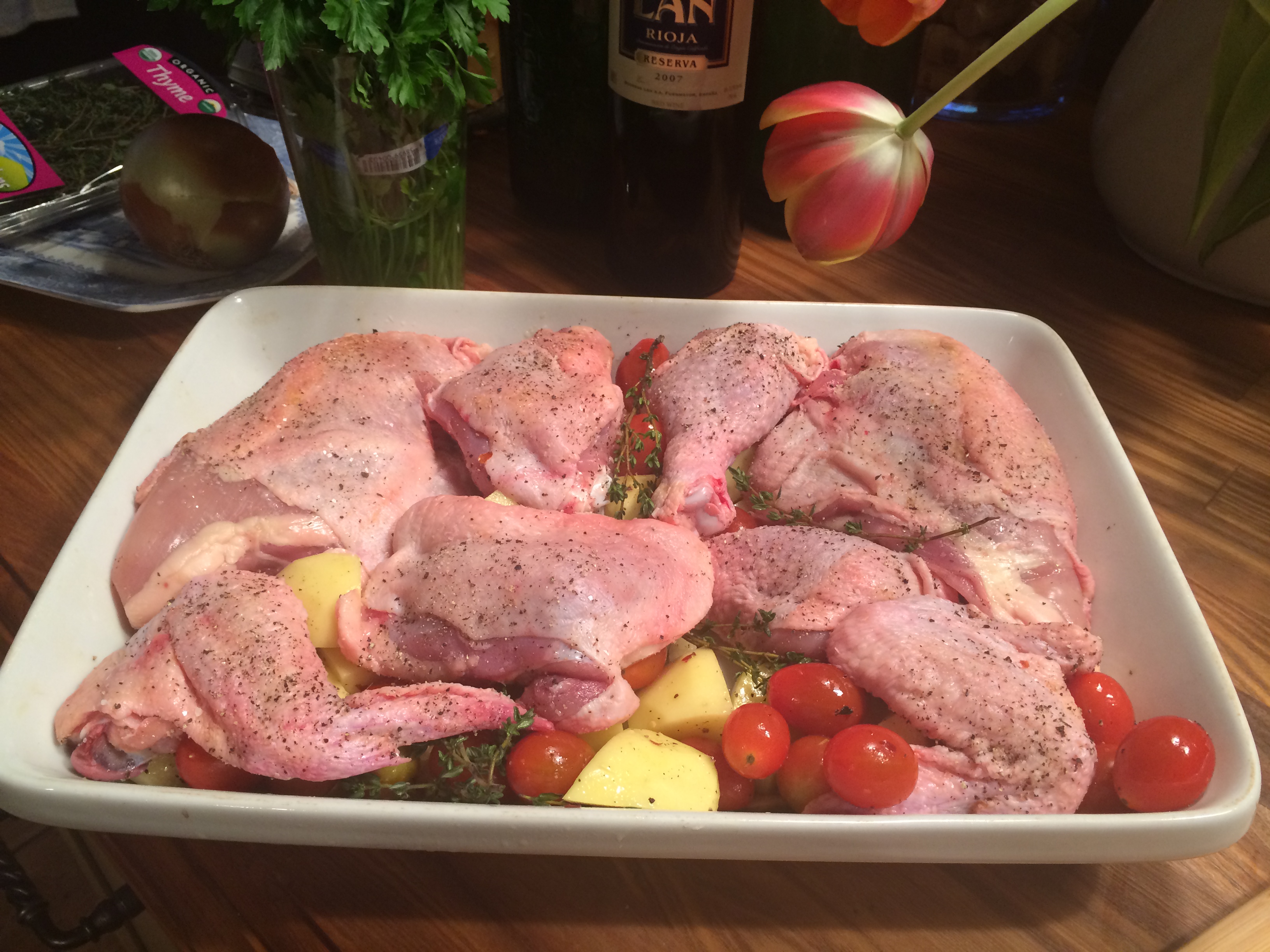You all know by now how very much I love one pan meals. I am talking about everything goes in one pan into the oven and cooks. Not slow cooked just regular meals in one pan!!!!! So simple to prepare , you’ll look like you really know what you’re doing and so delicious to eat. This one got a ringing endorsement from Joel and he’s as fussy as they come. This one should be perfect for whole family and should serve 4 . This is what I did. Last night I just used chicken thighs you can use whatever parts of chicken you prefer. Skin on Bone in is preferred here.