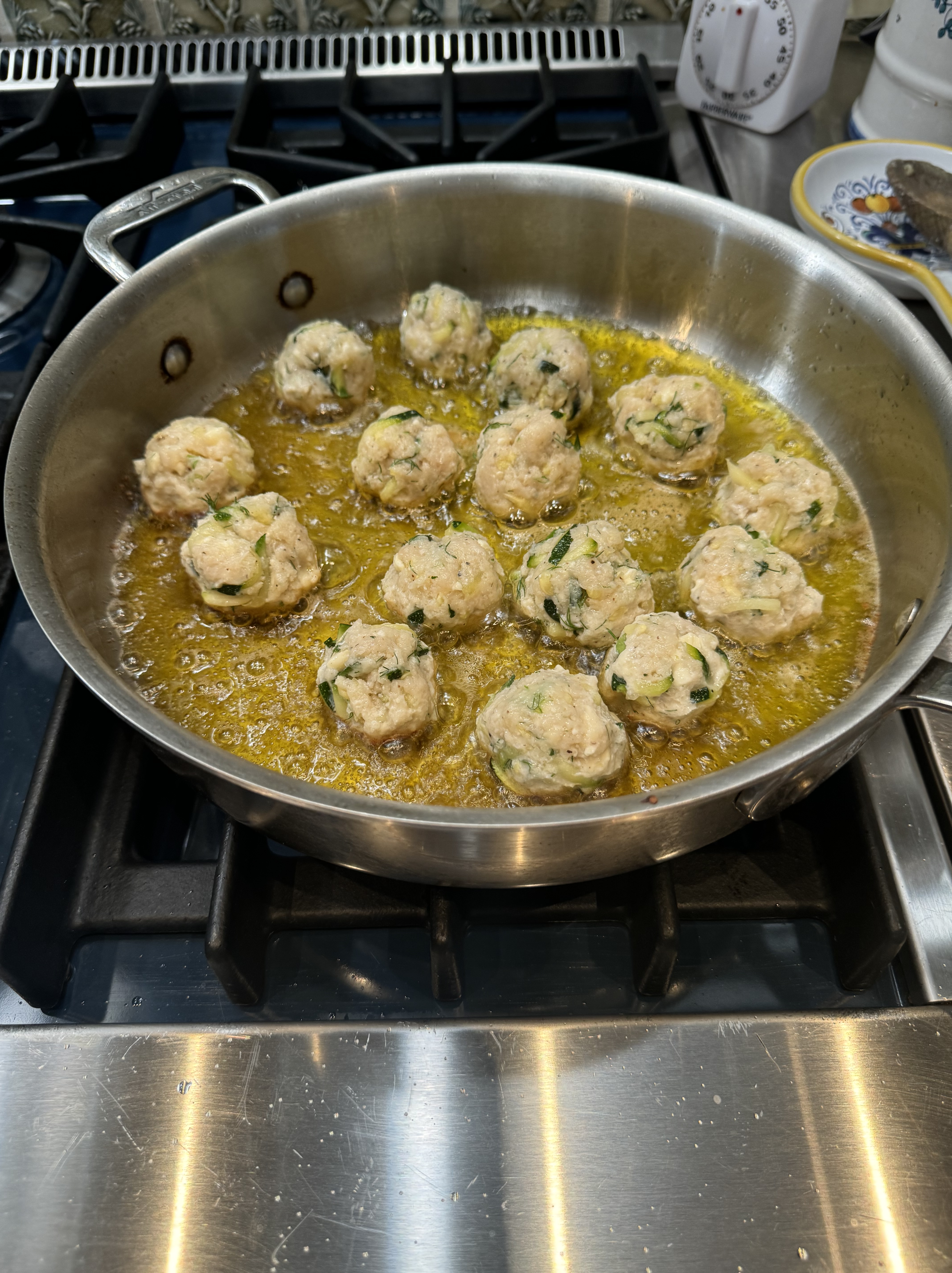 Heat Olive Oil ( a fair amount to cover bottom and a little more ) Heat up over medium heat when oil is hot place meatballs and cook until golden brown, rotating to brown all sides to the best of your ability. App. 6-7 minutes . I did it in 2 batches. After cooking meatballs I blotted excess oil out on paper towels covered with aluminum foil till ready to eat.
