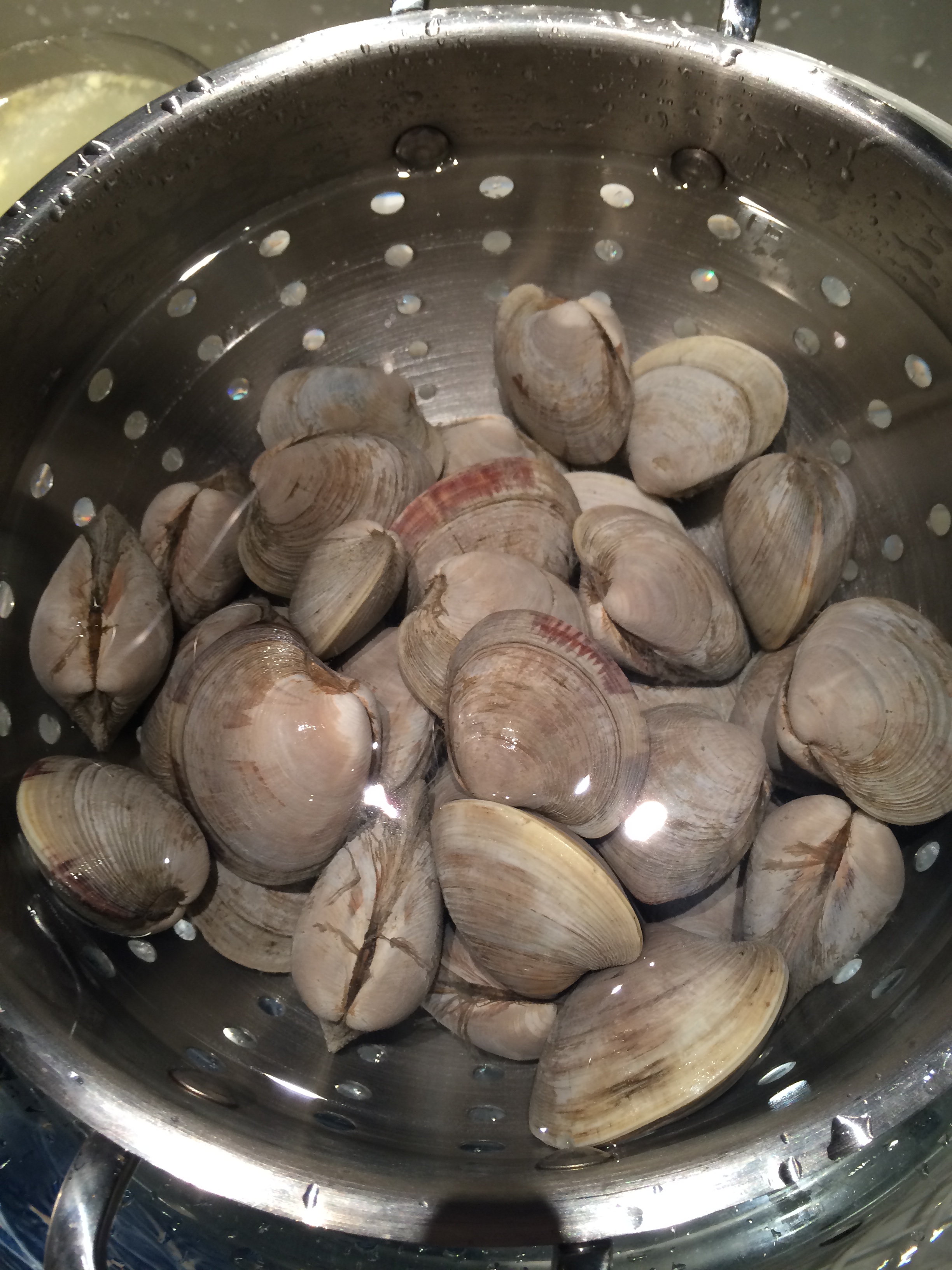 I placed my clams in a colander and I put the colander in a larger bowl in the sink and I filled the bowl with cold water. I let the clams soak for a few minutes, then rubbed with my fingers to dislodge any dirt; then drained the clams. Throw away any clams that remain open or were smashed. ( my clams were pretty clean) I purchased them clean from Whole Foods. Any Fish Store will clean them for you, but always run them through this process to remove any residual sand, etc.