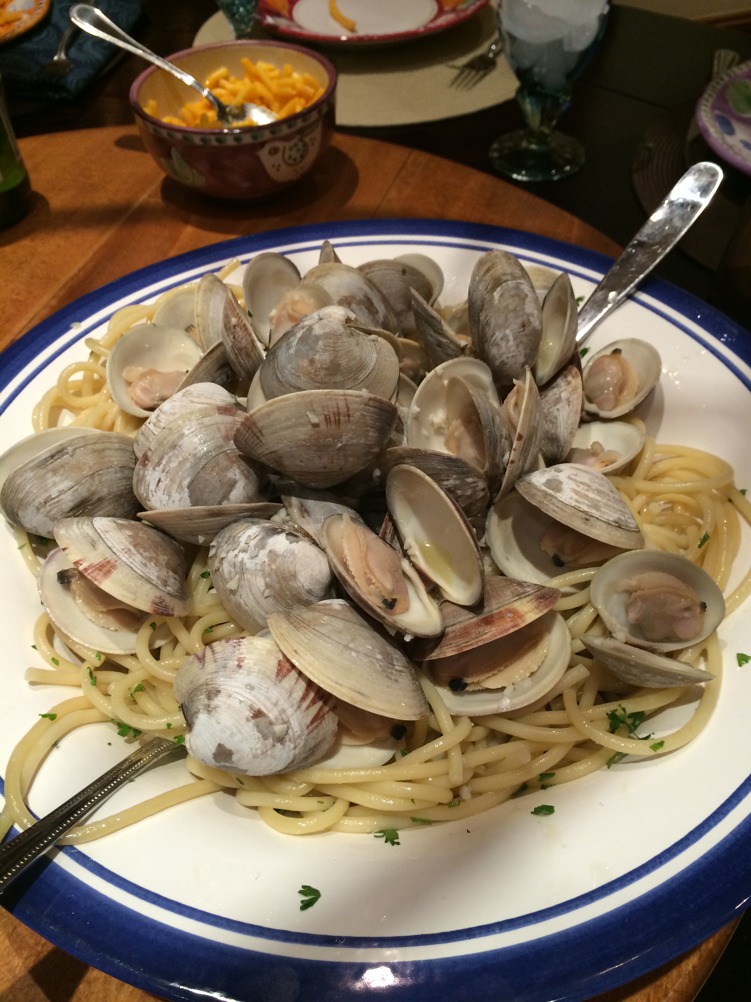Once pasta is al dente and drained I transferred to a large serving bowl and added 1 Tbsp. of Olive Oil to pasta, top with clams. Sprinkle if you’d like a tiny bit of coarse salt now if you feel it needs it. I did not need to add any additional salt or pepper. Adjust to your taste.