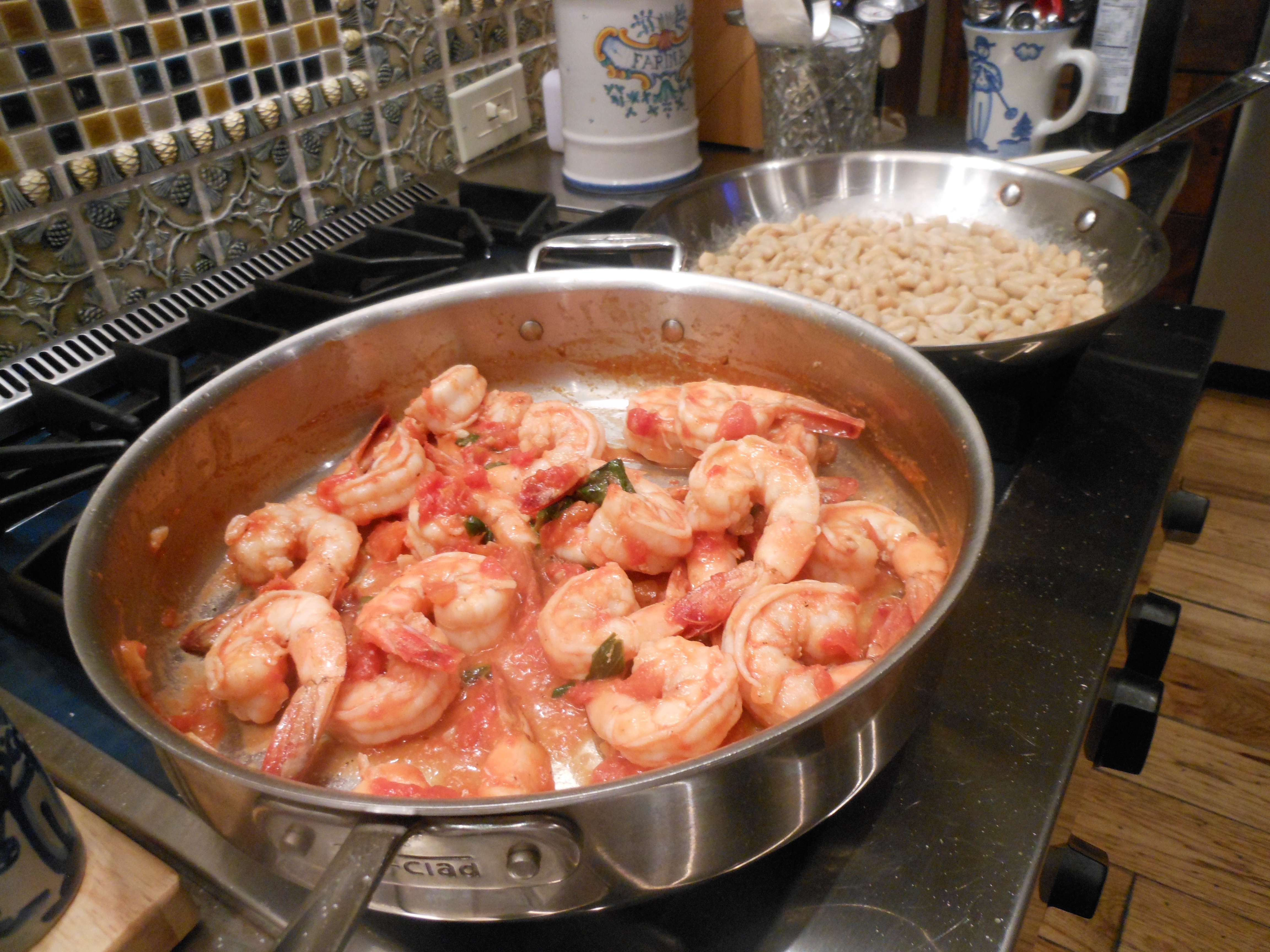 Drain the beans over a bowl and reserve the liquid. Put the white beans in a large skillet with just enough of their liquid to moisten them. Add 2 tablespoons of the olive oil and bring the beans to a low simmer. Keep them warm while you prepare the shrimp. Lay out the shrimp on some paper towels and sprinkle with kosher salt and freshly ground black pepper.