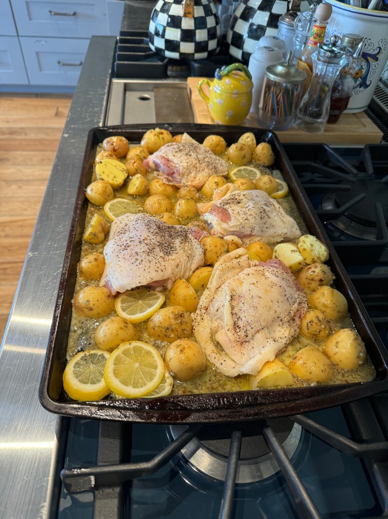 Pour potatoes onto a well sprayed ( cooking spray like Pam) sheet pan. Arrange lemon between the potatoes, place chicken thighs on sheet pan — I like to make sure that the chicken is directly on the sheet pan