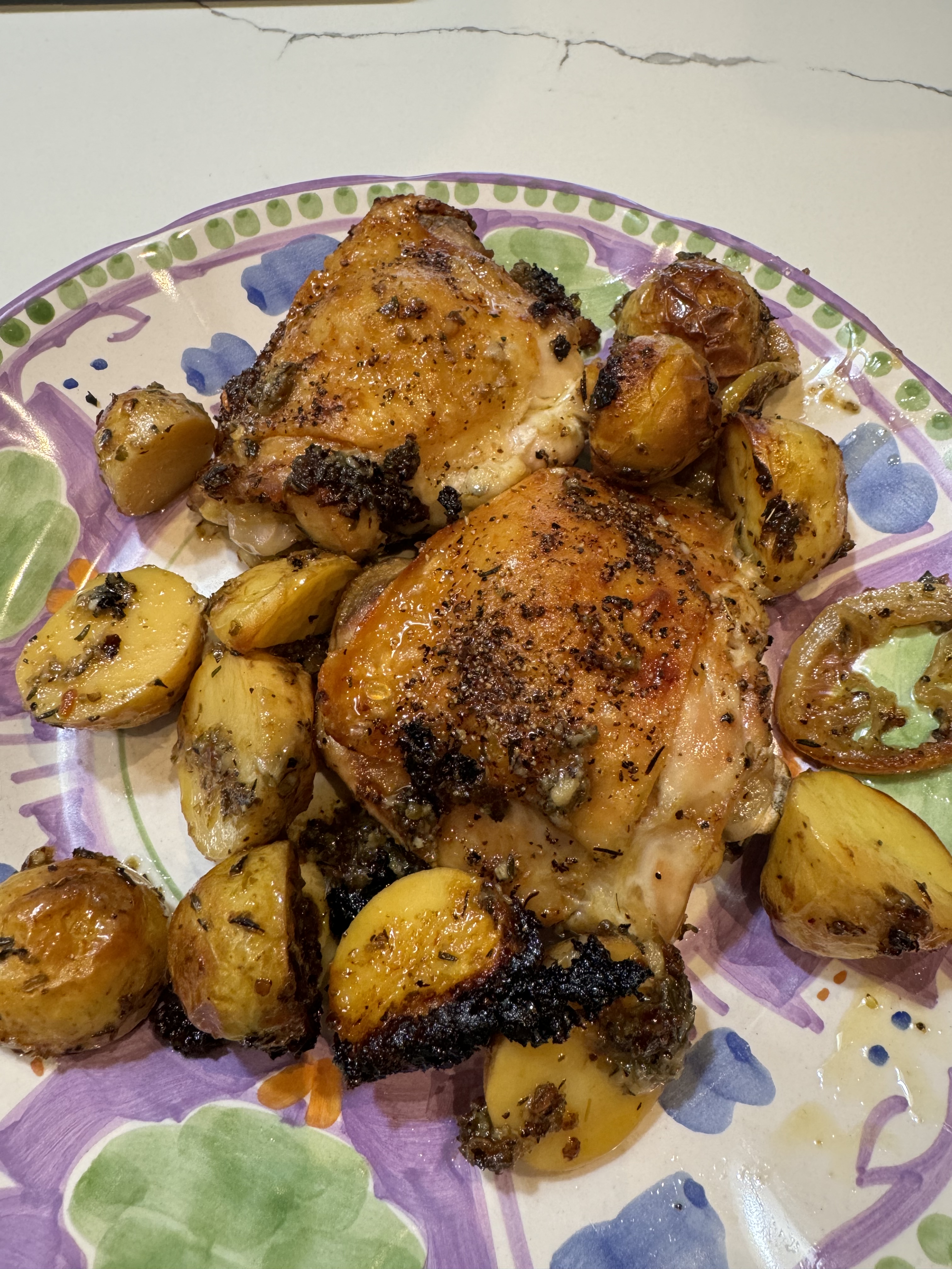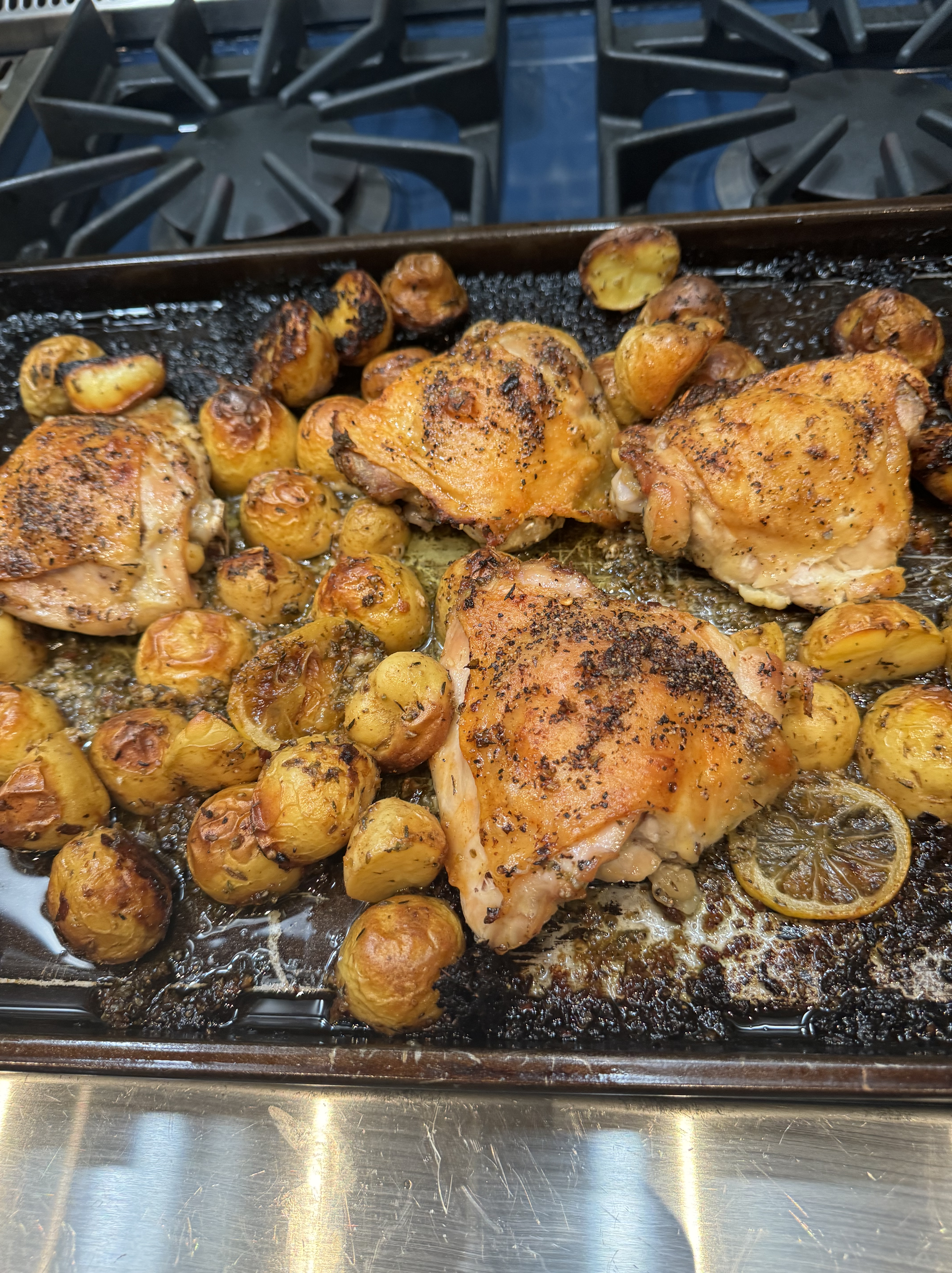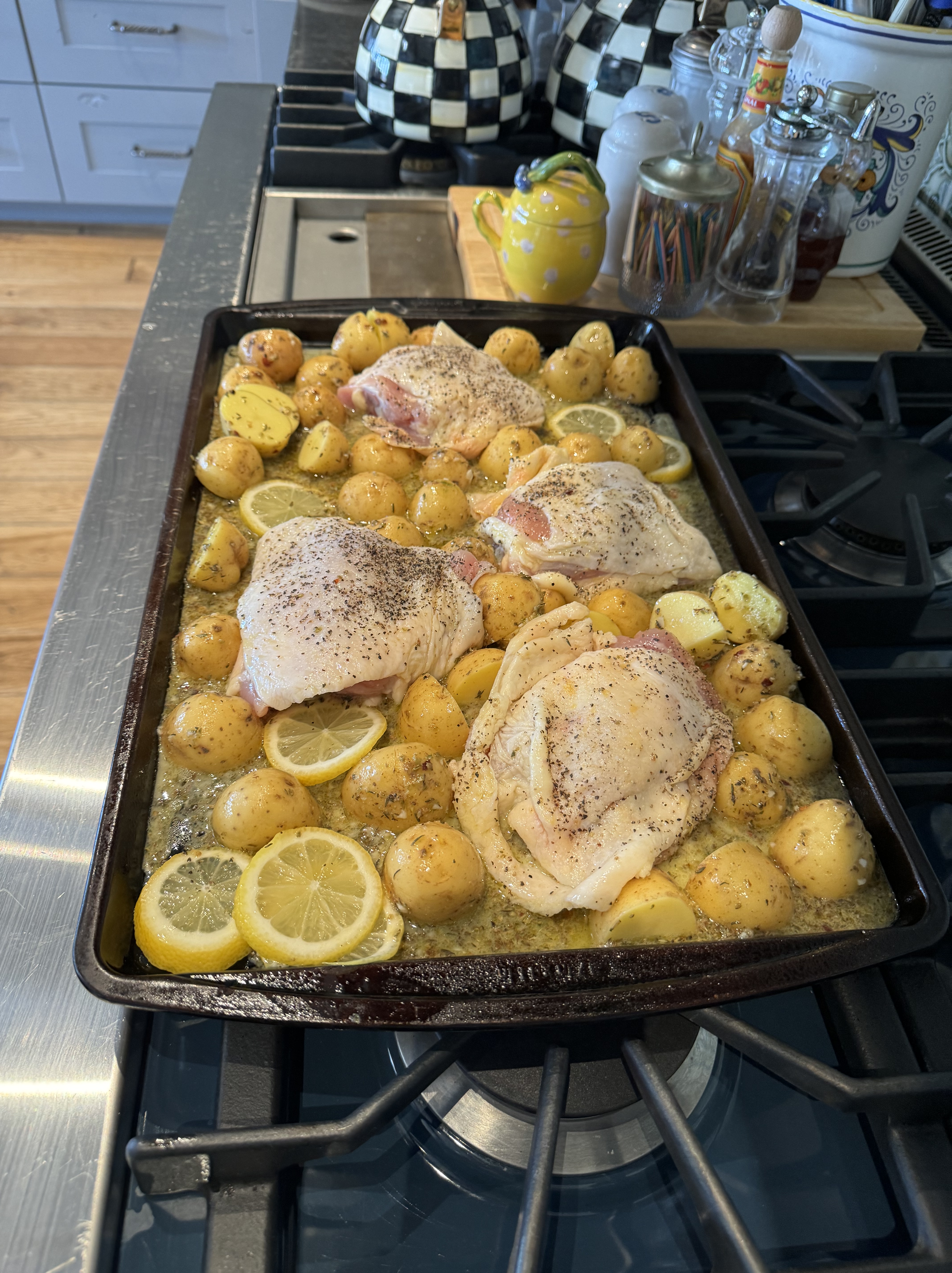 Pour potatoes onto a well sprayed ( cooking spray like Pam) sheet pan. Arrange lemon between the potatoes, place chicken thighs on sheet pan — I like to make sure that the chicken is directly on the sheet pan