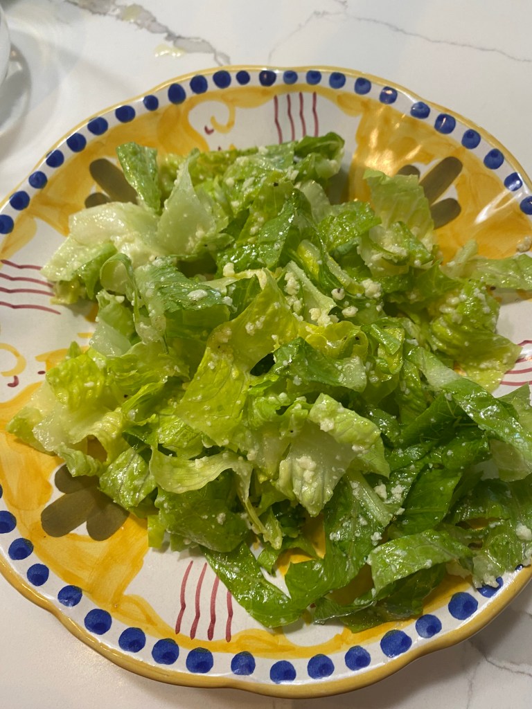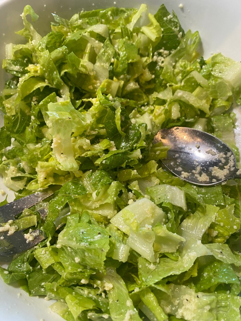 This salad is so delicious so fresh tasting and so easy to make. Very simple with very simple ingredients — Romaine lettuce, Lemons, Parmesan Cheese, Olive Oil and Salt and Pepper.