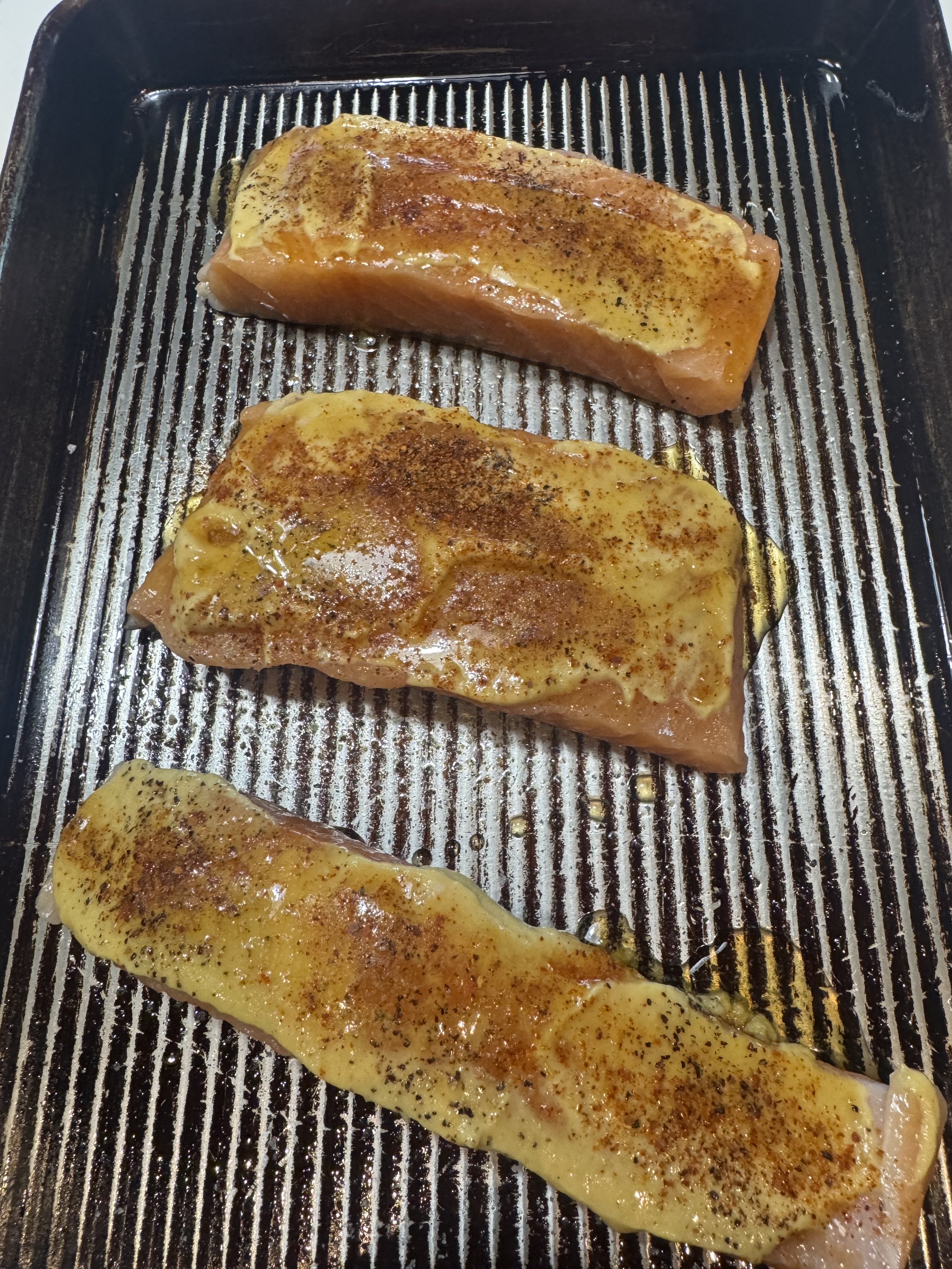 top each piece with dijon mustard — I just spread a thin amount on top of each– add a little olive oil spray or a drizzle of olive oil, season with Salt and Pepper, and the chili lime seasoning and drizzle the hot honey over each filet.