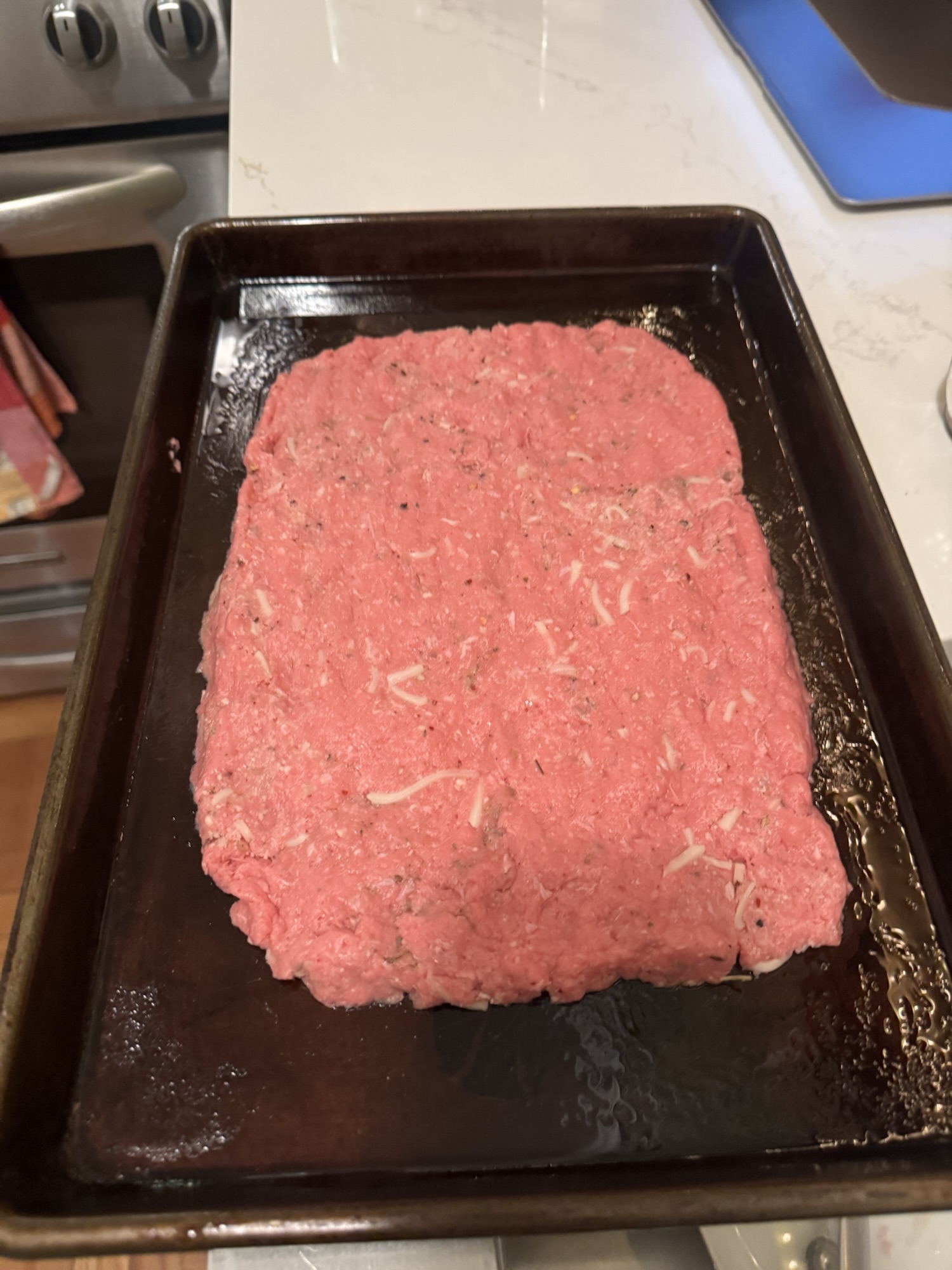 Scoop the chicken mixture onto the prepared pan and form it into a flat rectangle. I really pressed and try to get it even ( see pic) ends may have been a little thinner which came up very crispy which I liked a lot. I also gave it a very light spray of olive oil this step may or may not have been necessary but I did it. You can also drizzle real EVOO over it — up to you