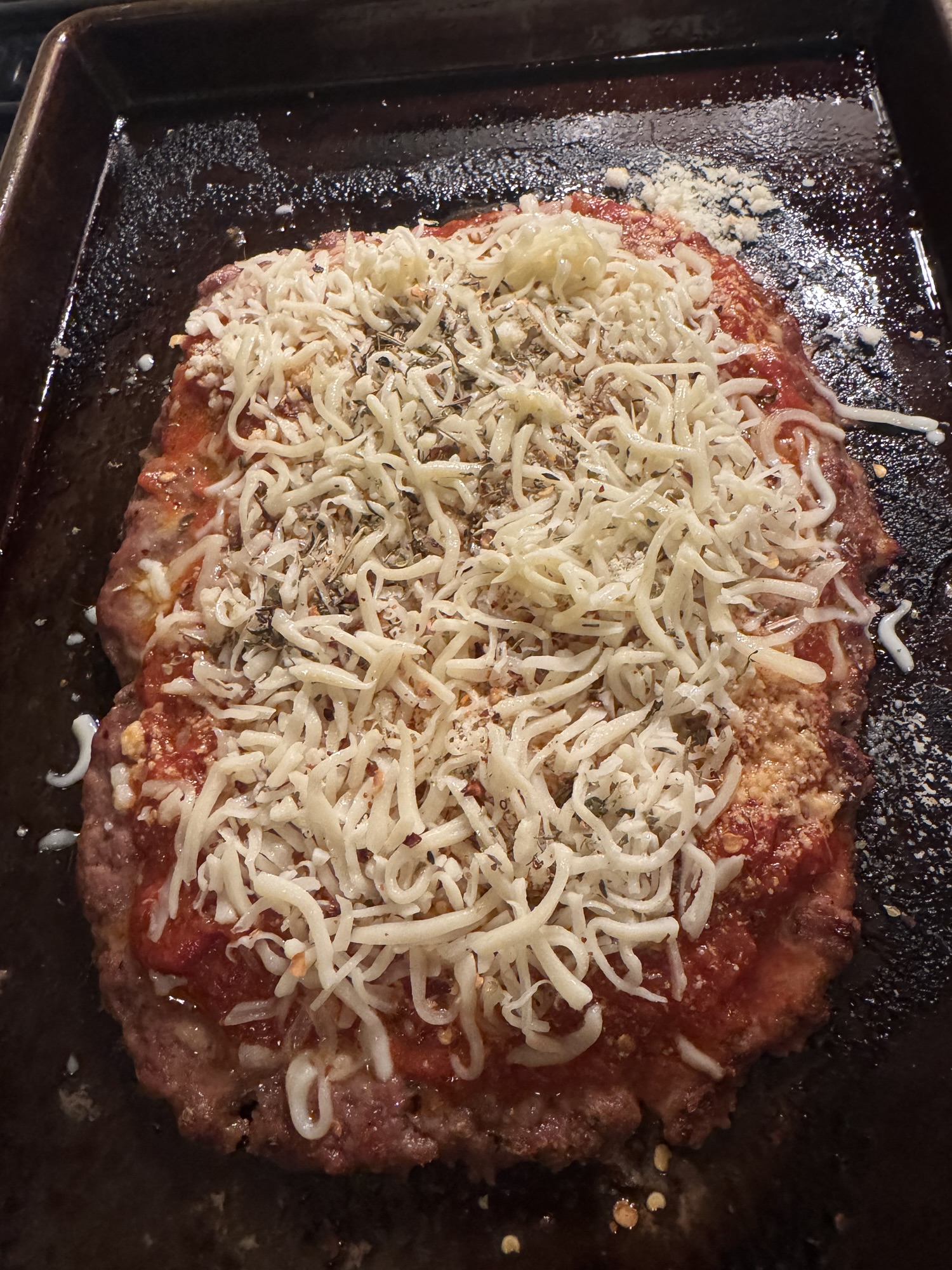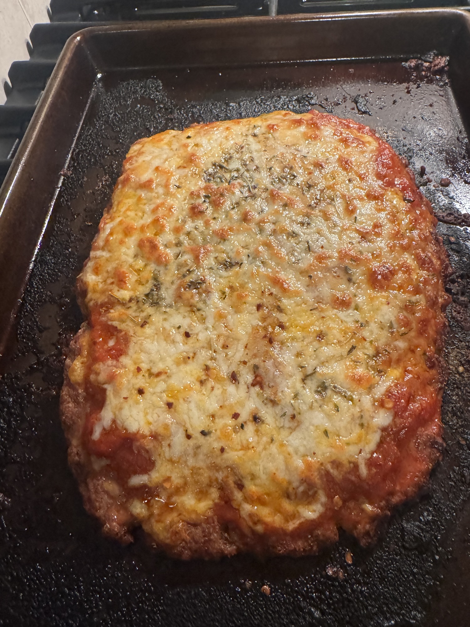 I made 1 lb. ground chicken and we ate the whole thing. I suggest doubling up recipe for more but use a larger sheet pan so base of chicken is still thin. After the first bake at 400 degrees turn up the oven to 425 degrees which will help the cheese melt perfectly and gives everything a golden, bubbly finish. Don’t overload with toppings, this crust is sturdy but piling on too many wet ingredients (extra sauce etc) Keep it balanced for the best texture.