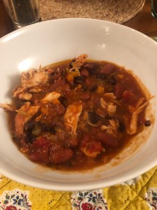 Bring the liquid to a slow simmer. Reduce the heat to medium low and simmer gently uncovered until the chicken is almost cooked through, turning the chicken breasts over and stirring mixture occasionally, app. 30 minutes. Using tongs if you have them, if you don’t , buy them, remove the chicken to a plate and allow to cool ( about 15 minutes) Discard the bay leaf, add the beans to the pot ( remember to drain) and bring to a simmer until the liquid is reduced to a stew-like consistency, probably another 15 minutes or so.