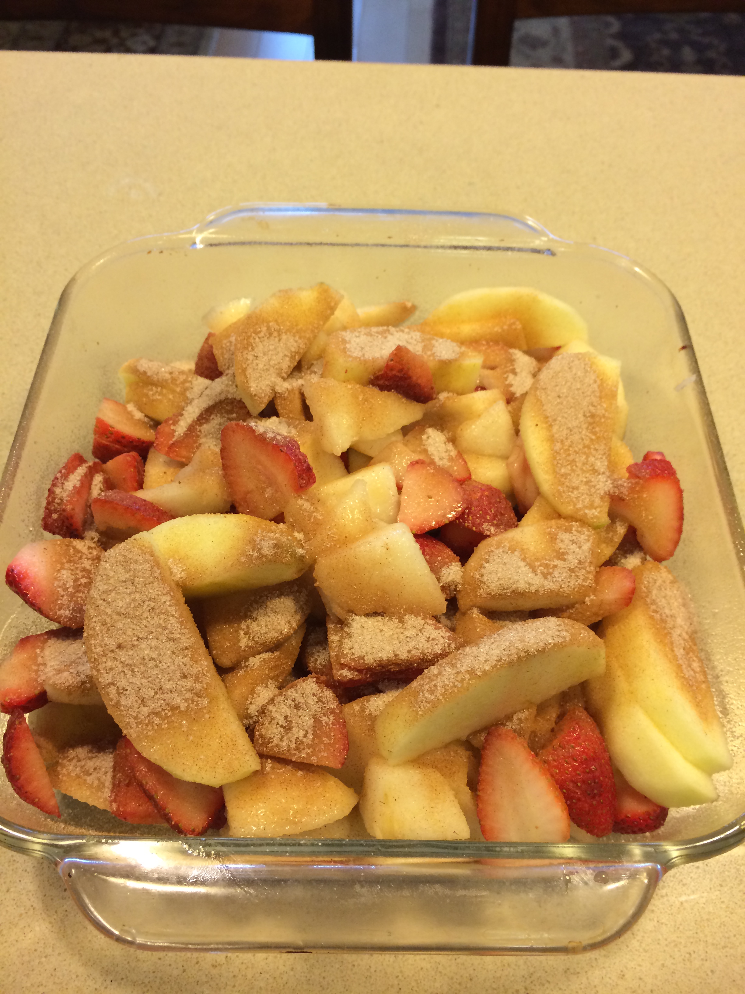 Pour boiling water over the dough and fruit before you bake it. Sprinkle top with 1/4 turbinado sugar or regular sugar. Raw sugar or turbinado sugar makes it a little crunchier topping. I prefer it to regular sugar for a topping.