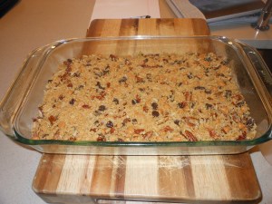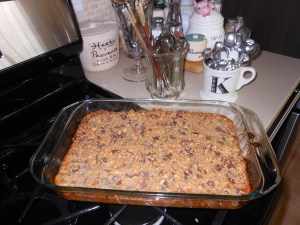 Melt butter, add brown sugar and corn syrup and combine well. Spray a 9×13 baking dish, Pyrex works well here. Pour butter mixture into baking dish and arrange bread slices flat in the mixture ( you will double stack the thin sliced bread) Unless the bread is 1″thick you will be doubling the standard sliced bread. Squeeze the bread to fit–it should hold 12 slices ( 6 double stacks), 3 on each side of a 9×13 baking dish.