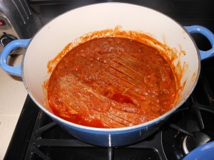 I sprinkled Lawry’s seasoned salt on both sides of the brisket (generously) then seared it in the Le Creuset pot with a little vegetable oil–probably about a tablespoon. (After the meat was seared, it shrunk to fit perfectly in my pot but I don’t think that a larger brisket would have fit.) Next, I added the tomato sauce and onions, covered the pot and put it in the oven. I cooked it for a total of 3 hours. I checked on it after each hour, which probably wasn’t even necessary. I then let it cool, off of the heat, for about an hour. Next, I sliced it with an electric knife, which came out beautifully. The meat was soft, but not falling apart at all. I then added the brown sugar to the gravy, put the brisket in a container with the gravy and froze it. I’ll take it out the night before I serve. Karyn pulses her gravy with an immersion blender. I didn’t do this but I think it makes for a good suggestion. In fact, I might still do it next time I make this recipe. I’ll let you know. Thanks again Michele and Karyn!