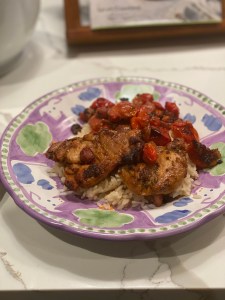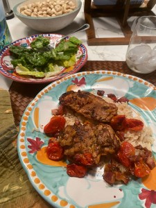 When fish is done to your liking remove fish to a platter. Brush fish with honey mixture. Add cilantro to tomatoes in pan, stirring gently to combine all ingredients. Top fish with tomato mixture and if you’d like a little more cilantro this would be a good time to add it.
