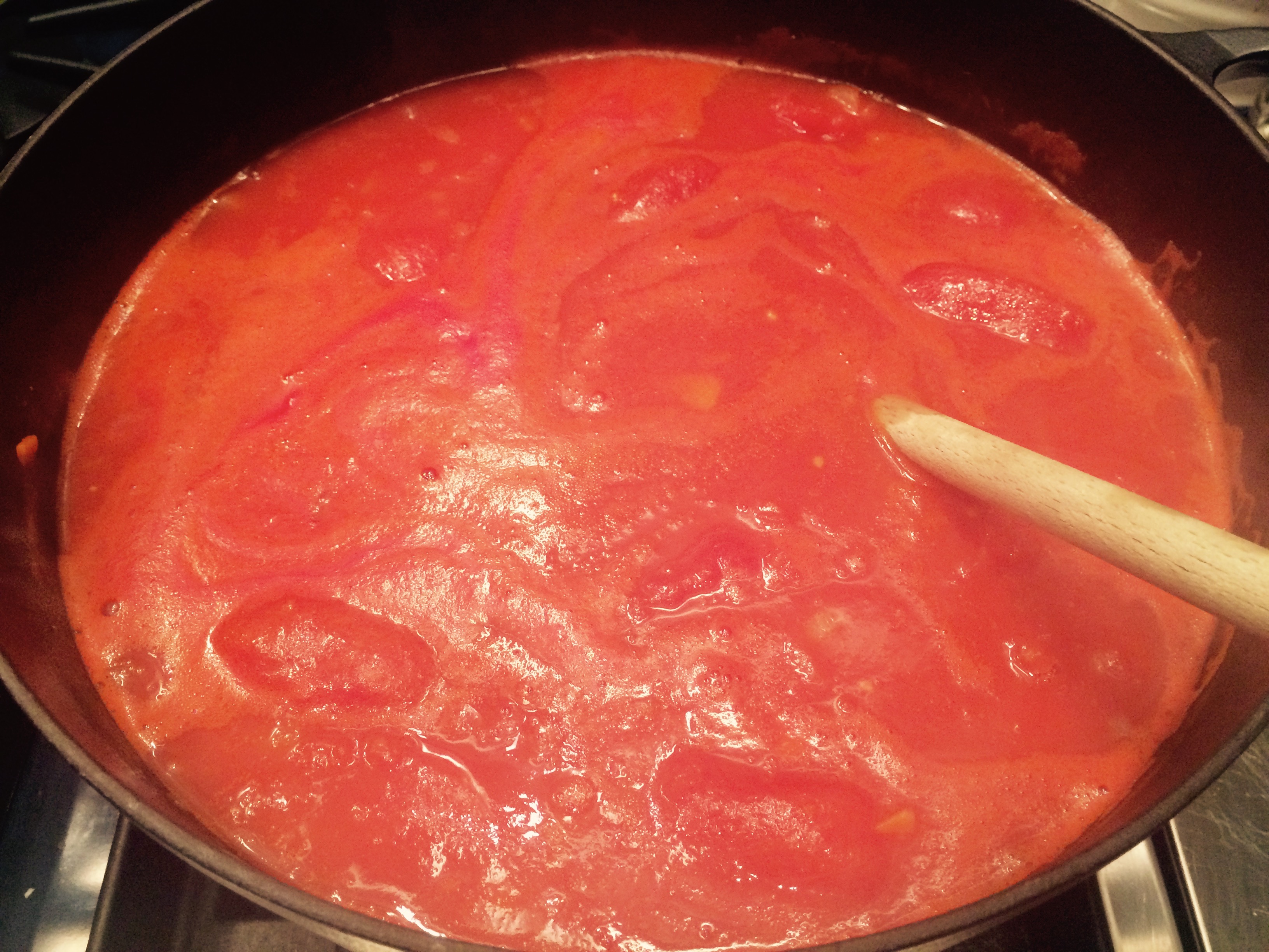for the meatballs, place the ground chicken, sausage,bread crumbs, garlic, Pecorino, Parmesan, milk, egg, salt and pepper all in a bowl and mix well with a fork. I use a teaspoon, and make 1 to 1 1/2 inch balls and drop onto parchment paper lined cookie sheet. you should have about 30 to 40 small balls. bake for 25 – 30 minutes, until cooked through and lightly browned. set them aside. (I made about 30 balls, they were a little larger this time out)