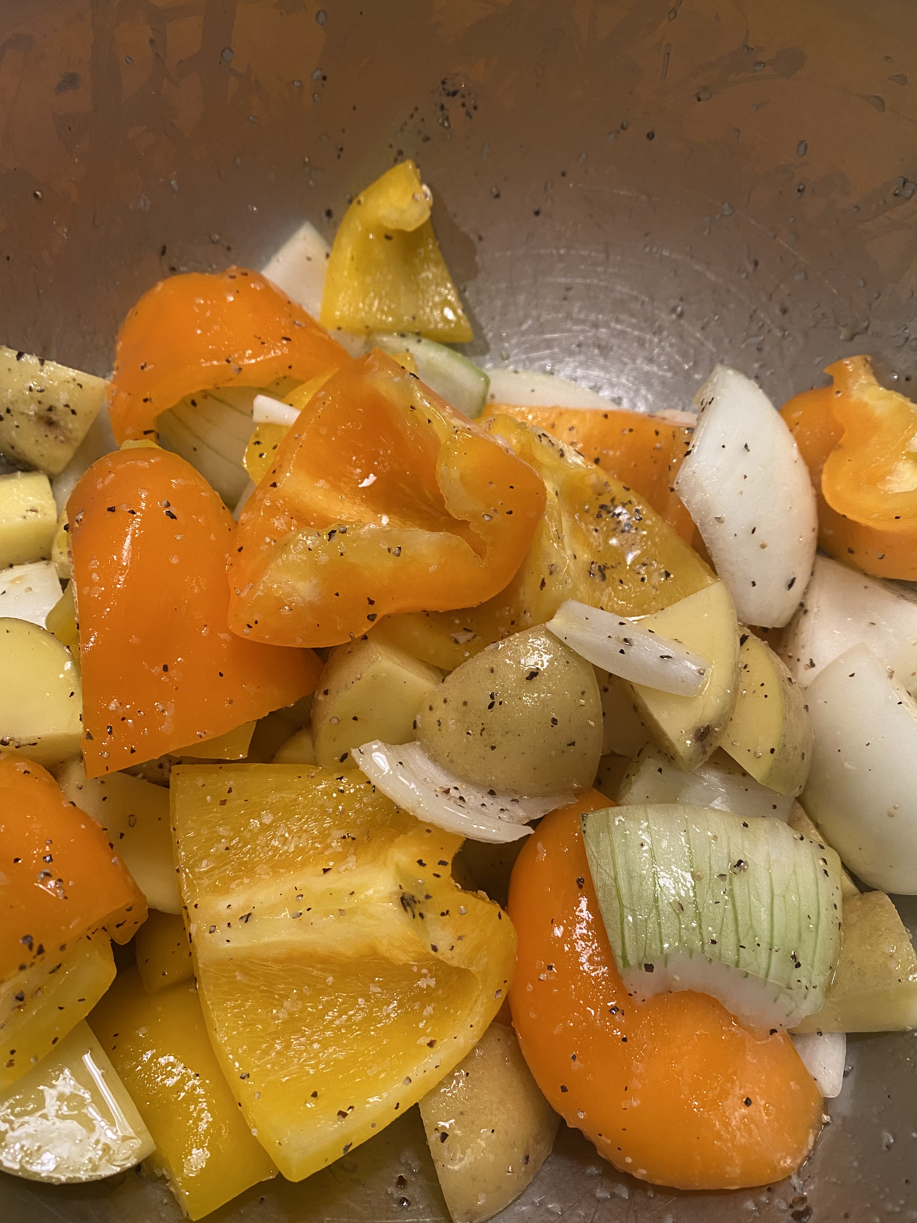 Place the eggplant , garlic, tomatoes, and thyme in baking dish. Sprinkle salt , pepper and crushed red pepper if you’re using it. With clean hands toss together until the eggplant is coated with olive oil and don’t worry if it’s over-crowded. It will break down and there will be plenty of room.