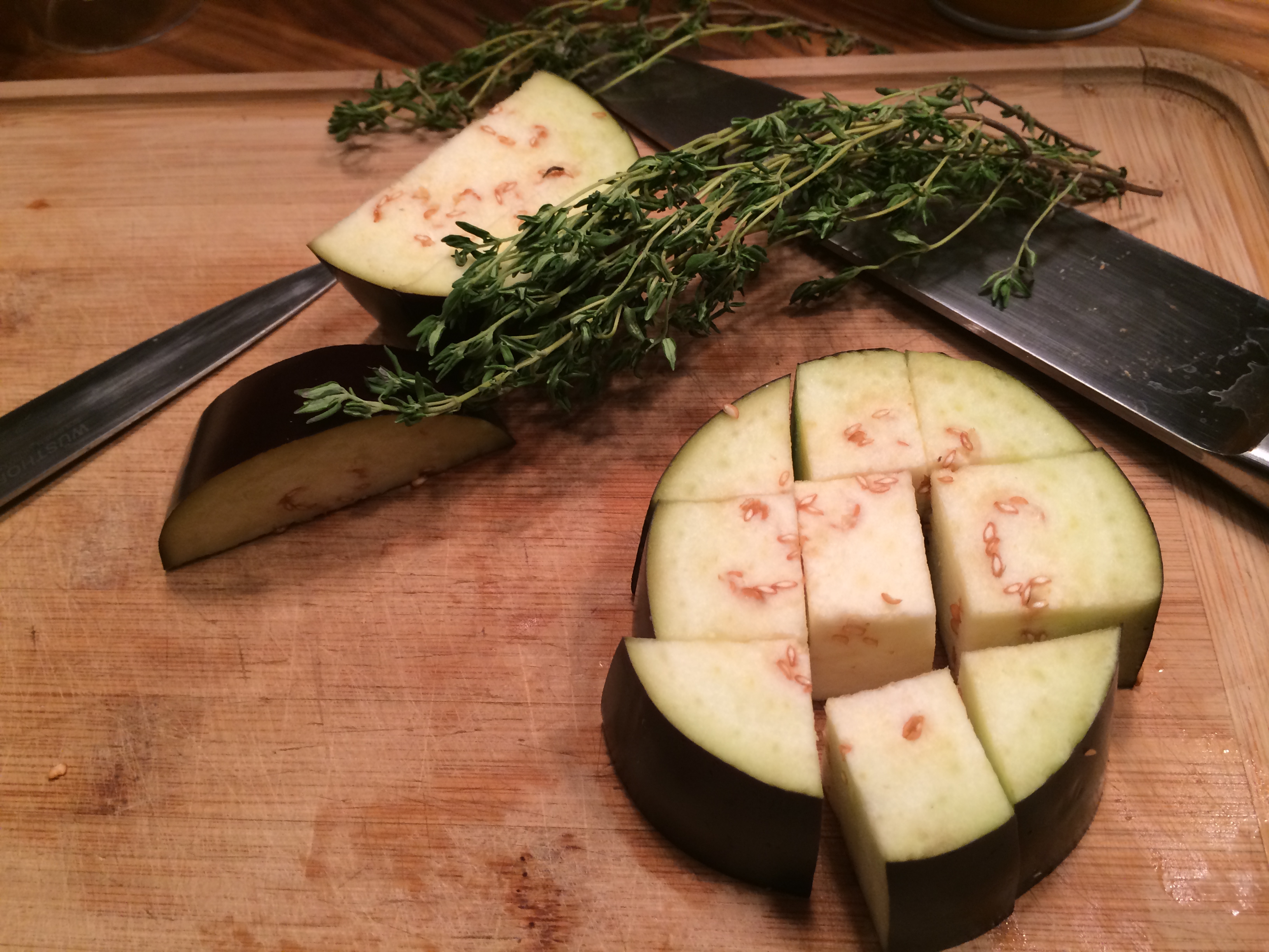 Preheat the oven to 400 degrees. Wash the eggplant and the tomatoes. Cut off and discard the stem. Cut the eggplant into 1 inch thick round pieces. Stack 2 rounds, then slice  rounds 2 x and 2x across to make 1″ cubes. ( see photos). Smash the 4 garlic cloves with the back of large knife. Prepare baking dish by spraying lightly with Pam spray.