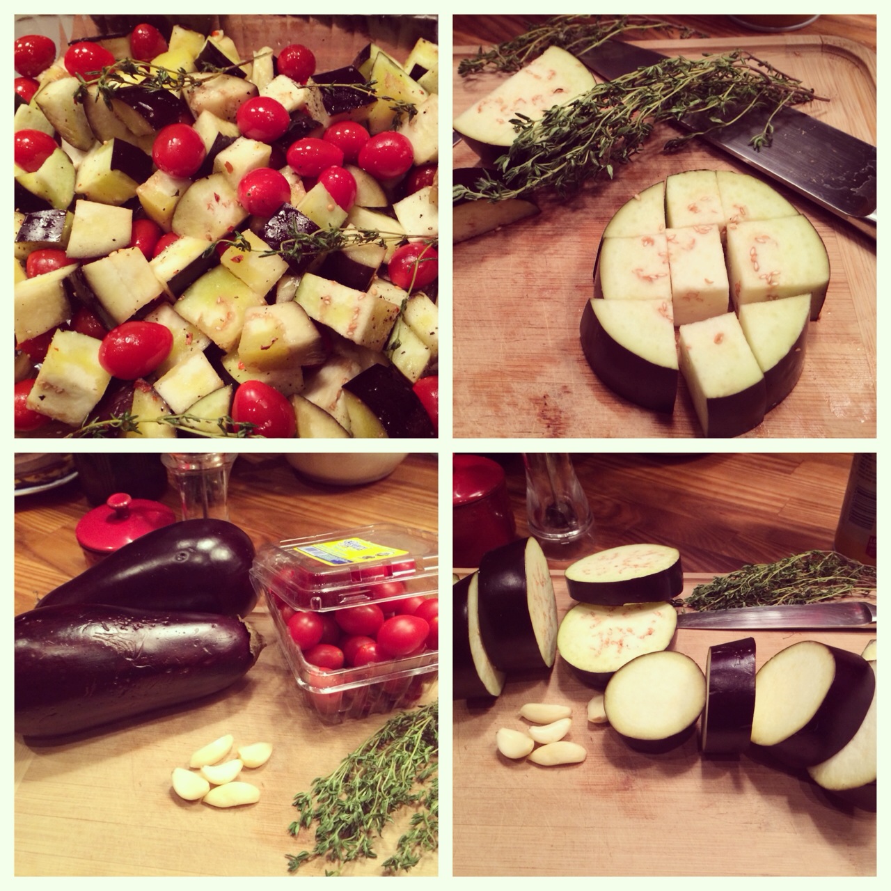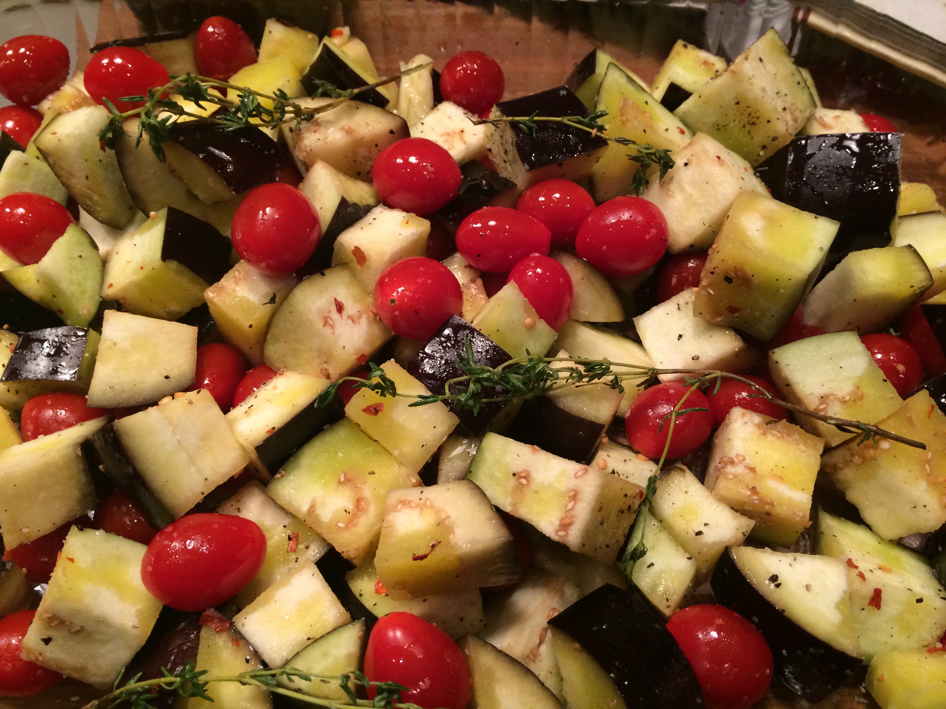 Place the eggplant , garlic, tomatoes, and thyme in baking dish.  Sprinkle salt , pepper and crushed red pepper if you’re using it. With clean hands toss together until the eggplant is coated with olive oil and don’t worry if it’s over-crowded. It will break down and there will be plenty of room.