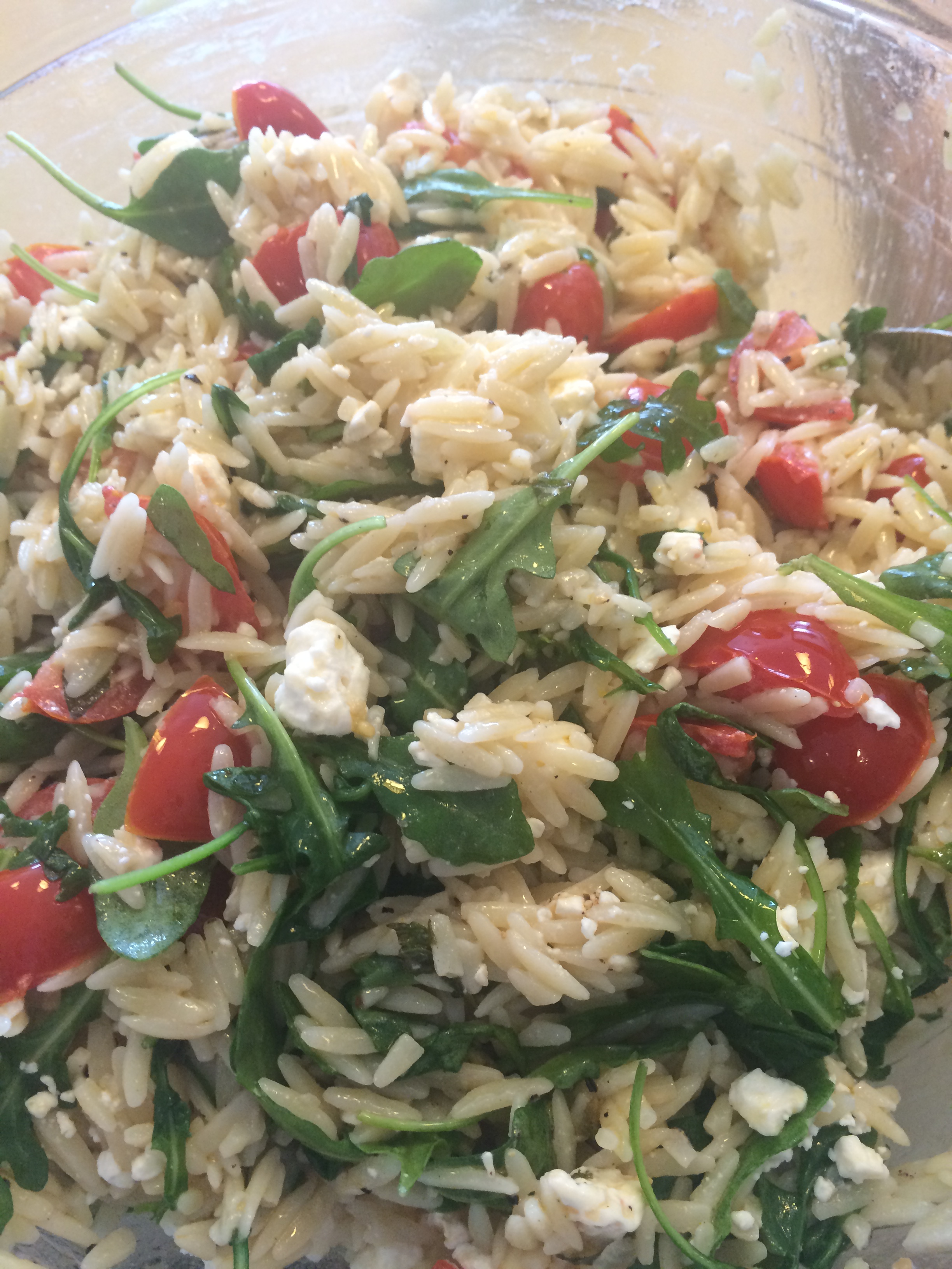 Drain the orzo and allow to cool a little bit. Add it to the bowl, and drizzle app. 1/8 of a cup of olive oil. Toss well . Taste for Salt and Pepper, I added 1 teaspoon kosher salt and 1/4 teaspoon ground black pepper. Adjust seasoning to your taste.  I put it in refrigerator till we ate dinner, it can be served cold or warm, delicious either way.