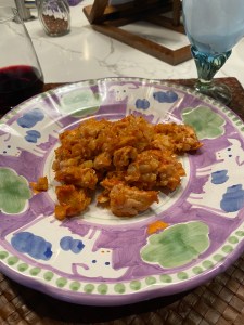 *a little note on what I did with chicken tenders. I put in a bowl and added a little olive oil ( just to give a light glaze to chicken) and kosher salt and freshly ground pepper–mixed around and heated up on a grill pan. If no grill pan any pan will do. I cooked chicken till just done because it’s going back in pan and into oven for more cooking. (but it was fully cooked)