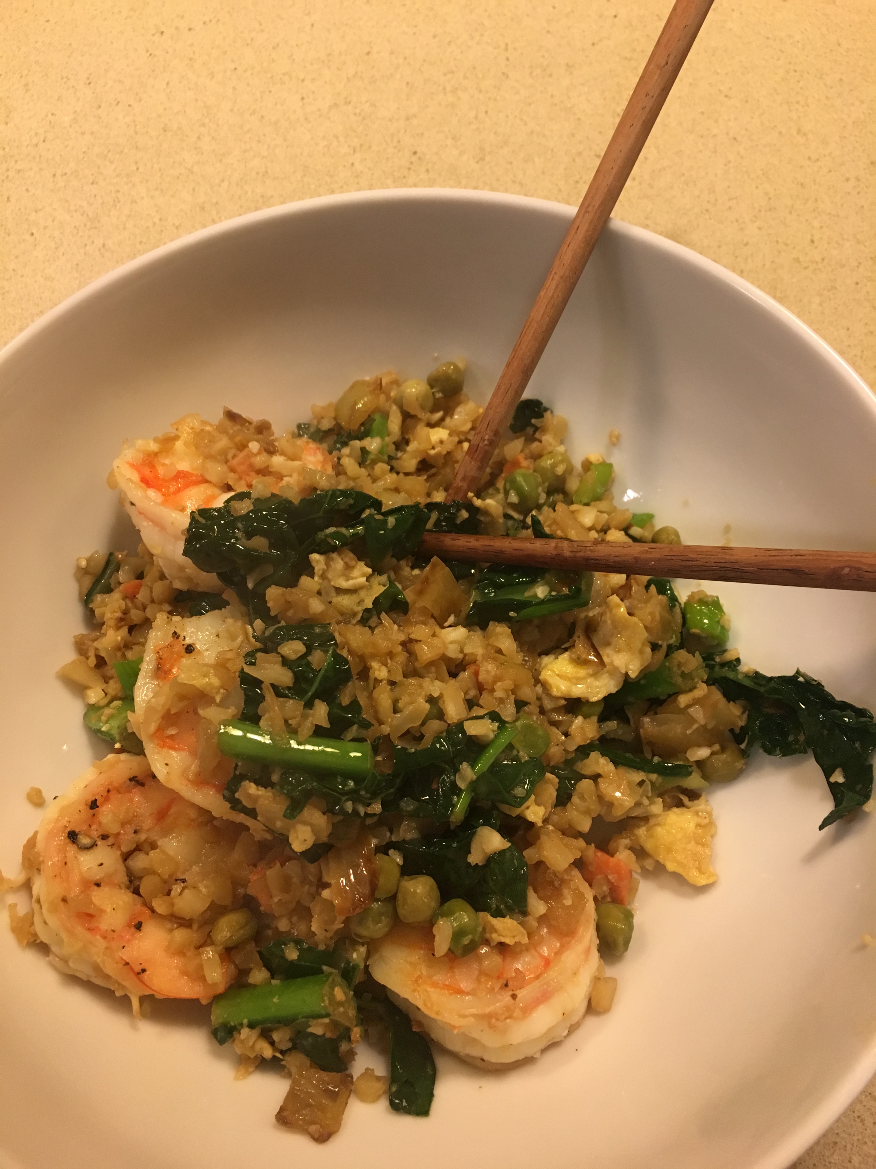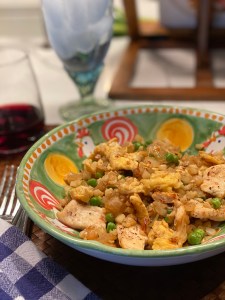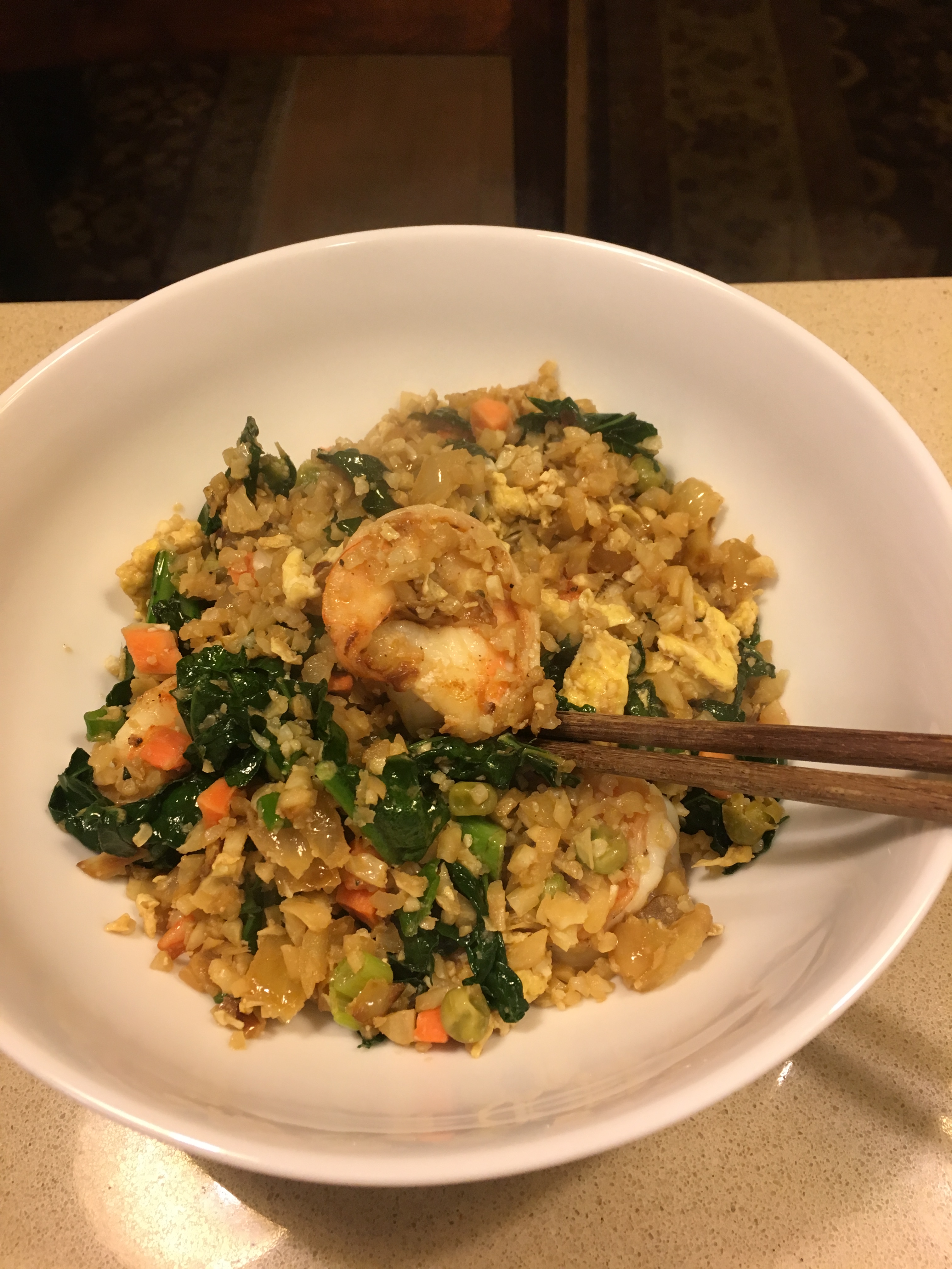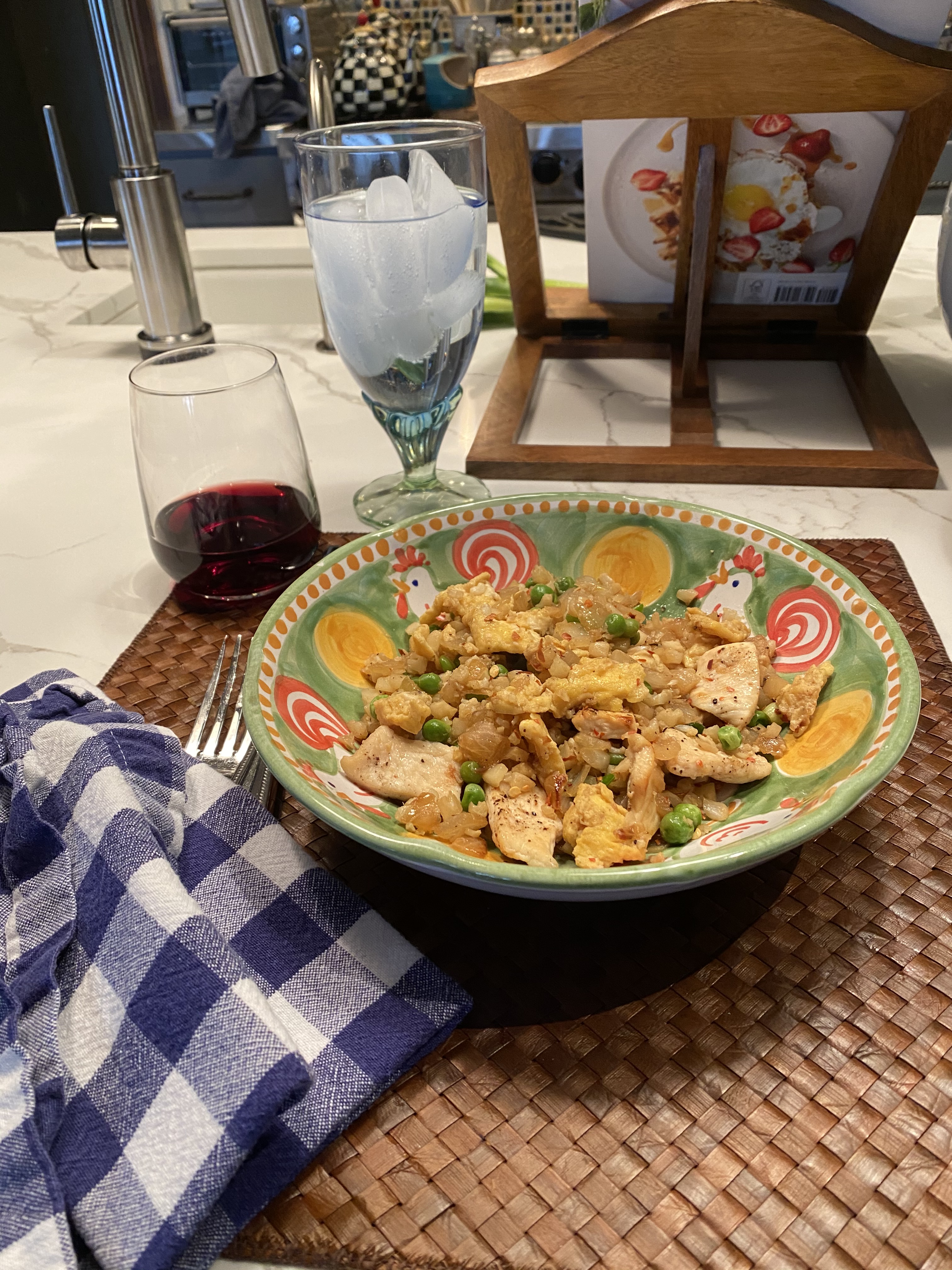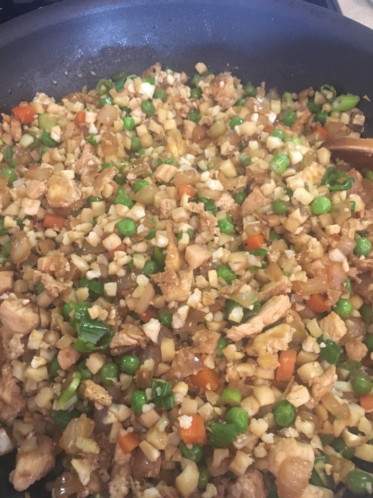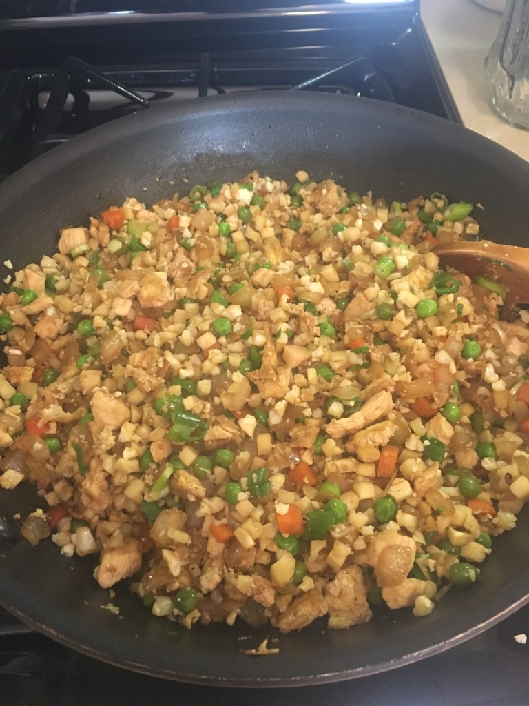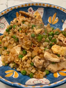 Heat the olive oil – Add the onion and cook for a few minutes till onions start to look translucent. ( app. 5 minutes) Add cauliflower rice and some kosher salt ( app. 1 teaspoon ) and cook stirring often to get this going. I sauteed for approximately 10 minutes until rice was tender (al dente), add cooked cut up chicken and 1/2 cup sauce and continue allowing to cook down. Continue stirring and cooking for a few more minutes. Taste for salt and tenderness of the rice– as I said I like rice to have a little bite not mushy. Add remaining 1/2 cup sauce and cook down a few more minutes. Toss in 1/2 cup mozzarella and 1/4 cup parmesan and mix well to combine.