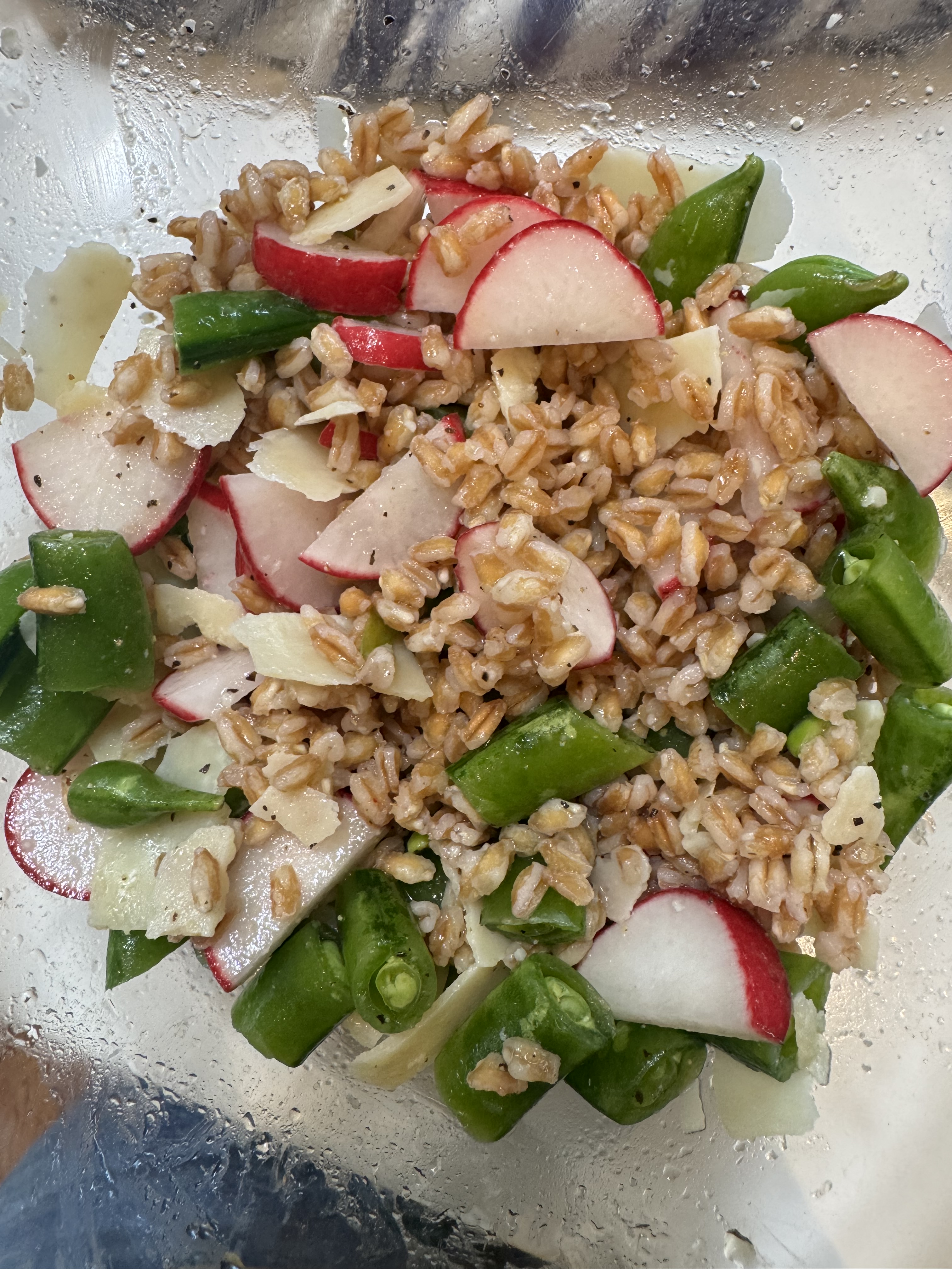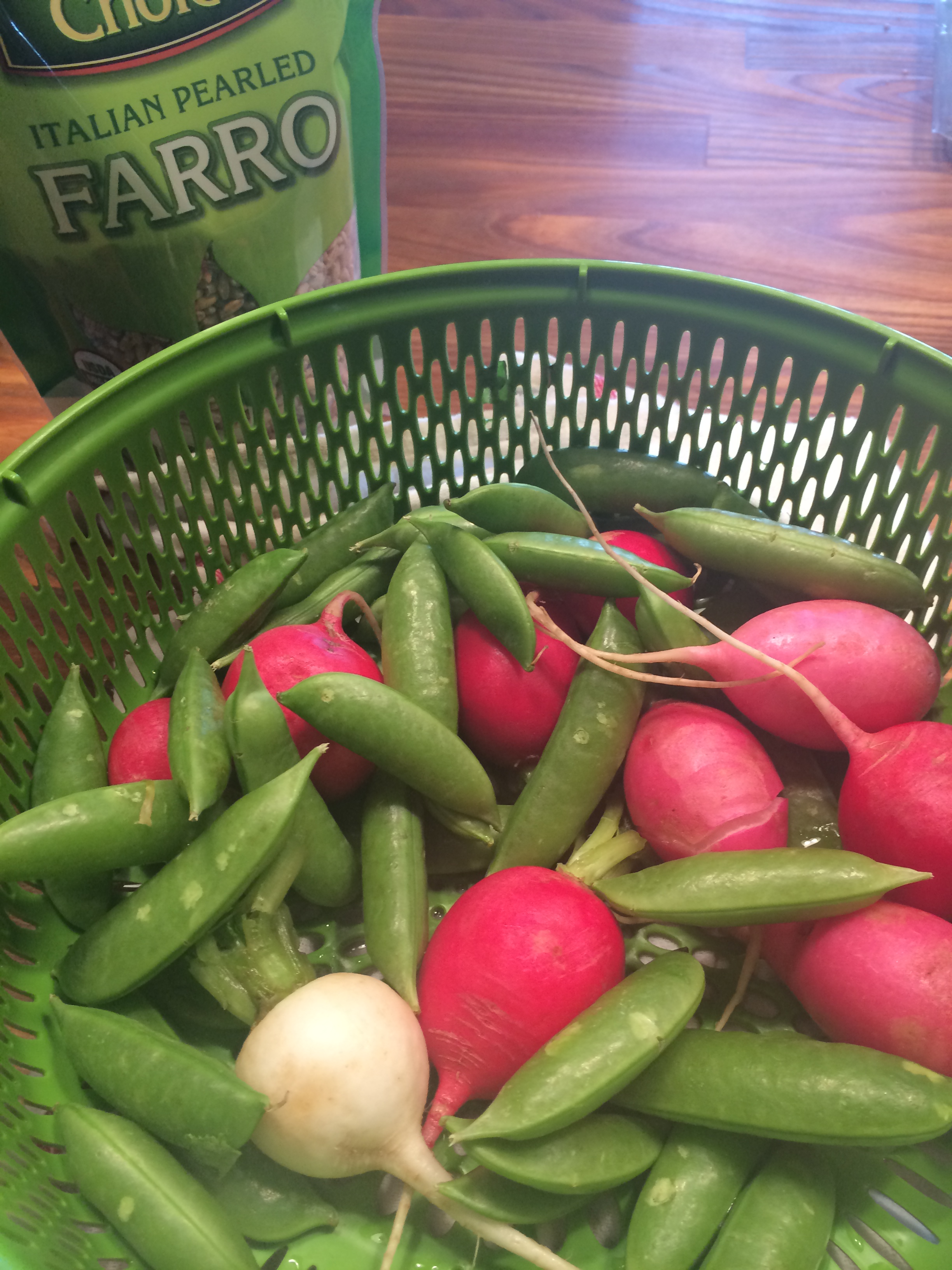 I am always on the search for some new vegetarian recipes to try out. The inspiration for this salad came from some beautiful radishes from the farmers market and some fresh sugar snap peas. During the summer months with all the beautiful fresh vegetables available it’s super easy to throw together these salads. The fresh parmesan pieces give it the extra kick and salt it needs, use as much or as little as you like. I prefer pearled farro for this recipe. Feel free to experiment and use whatever ingredients suit your taste.