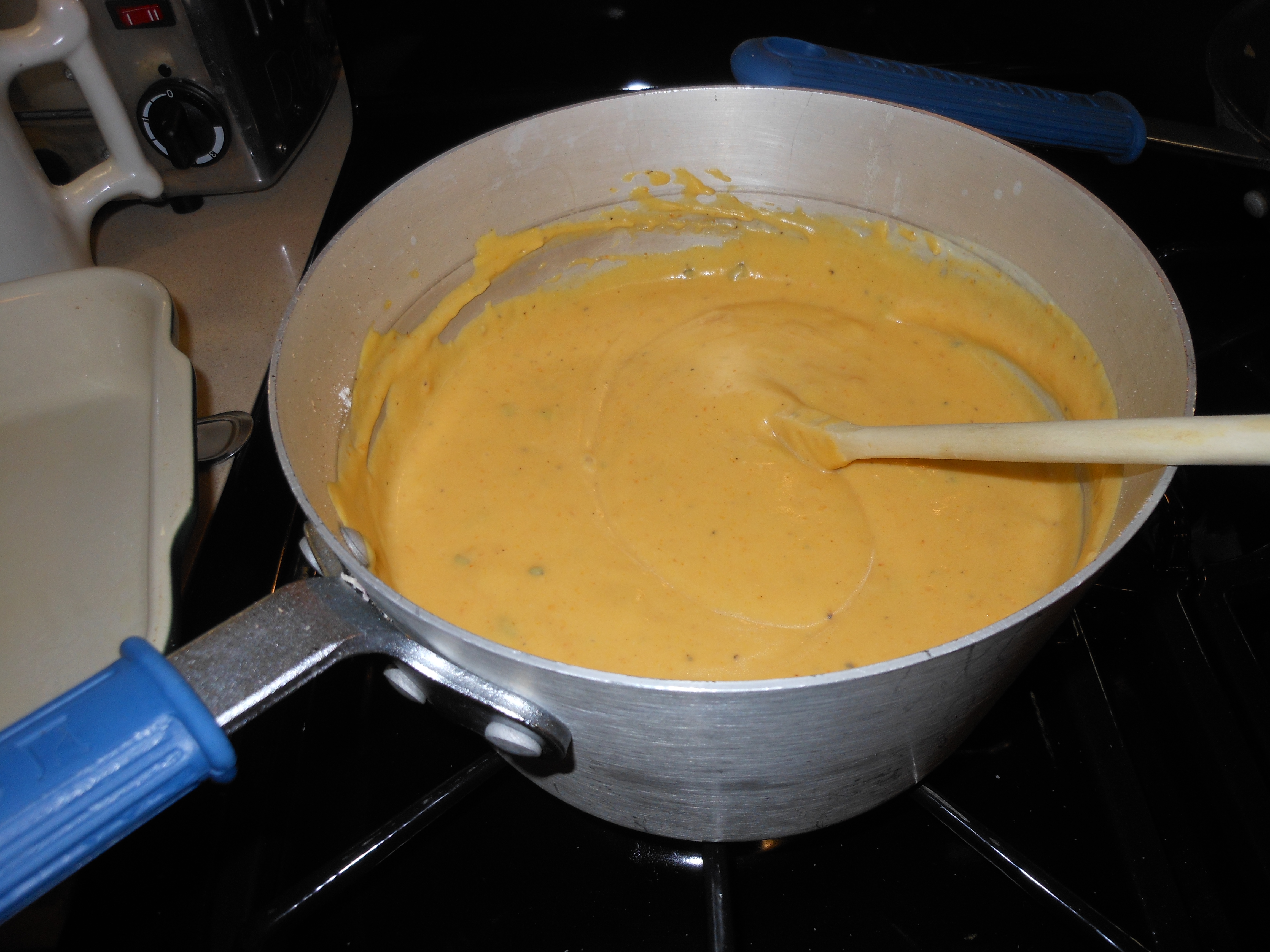 For the white sauce (Bechamel/Roux,) bring the milk to a simmer in a saucepan (not a full on boil.) Then, set aside the hot milk. Melt the stick of butter in a large saucepan. Add the flour and cook for about one minute, stirring constantly with a wooden spoon. Pour the hot milk into the butter-flour mixture all at once. Add 1 tablespoon kosher salt, 1 teaspoon freshly ground black pepper, and 1 teaspoon ground nutmeg, and sage if you’re adding it, and continue cooking over medium-low heat, stirring all the while. I start with a wooden spoon and as it thickens (about 5 minutes,) I switch to a whisk, until it is thick. Then I add the pumpkin and continue stirring but at this point, turn off the flame and remove from heat. Set aside off the heat.