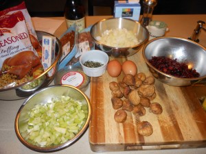 I put the stuffing in a well-sprayed, slightly buttered (optional), baking (gratin) dish. If you put this in the preheated over, you will likely cook it for at least 45 minutes and probably more like an hour to two hours if it’s doubled.  I also stir frequently while it is cooking, and then let it go for the last 15 minutes and it browns up. Taste for Salt and Pepper.