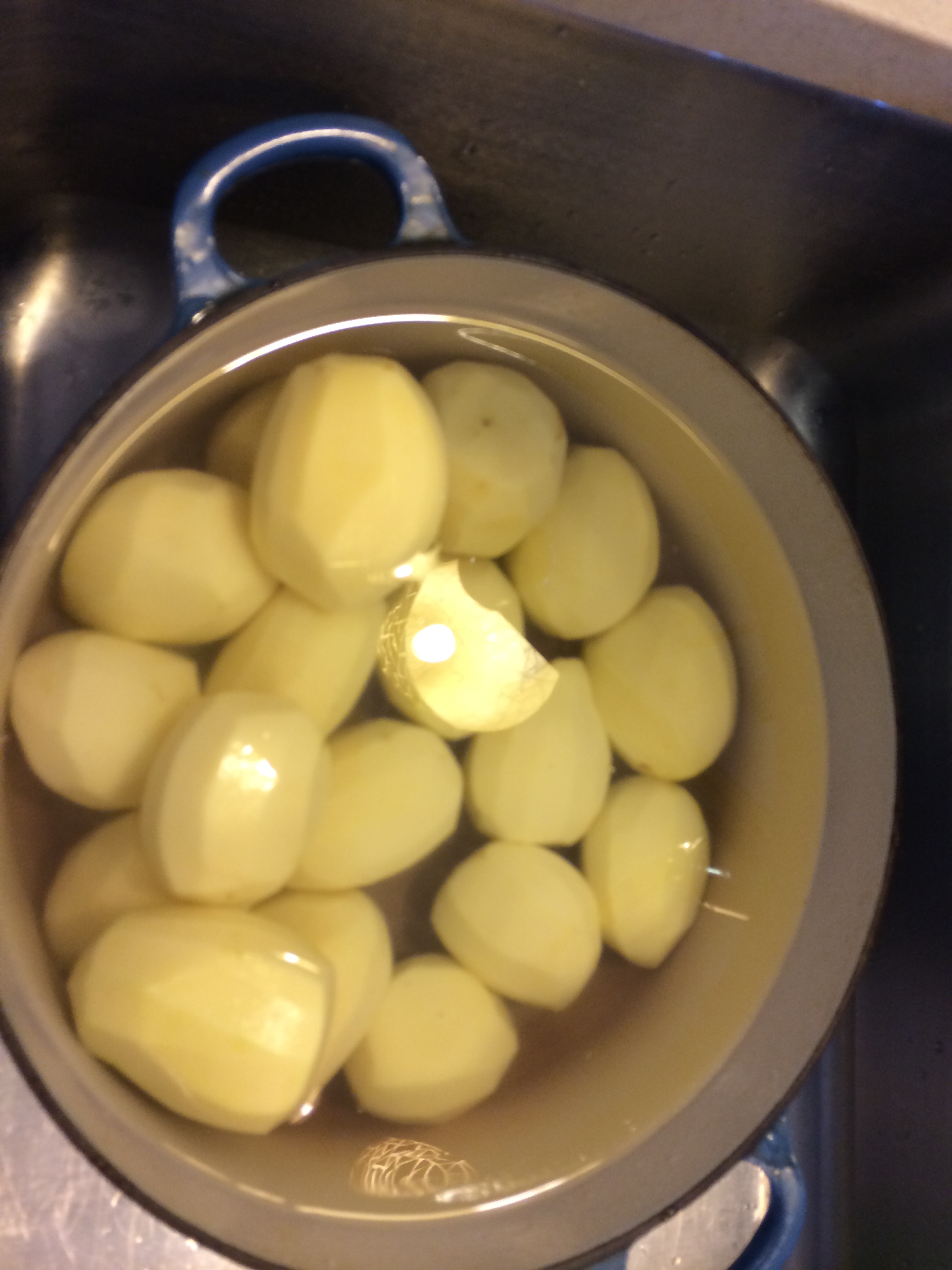 In a large enough pot to cook all of the potatoes fill pot with cold water to cover the potatoes. I bring to a boil and cook for about 30 – 35 minutes. When potatoes are cooked through, a fork should easily slide into the potatoes without resistance, potatoes should be soft but not falling apart.
