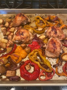 Add another  Tablespoon of Olive Oil to the marinated chicken. If it seems super dry add a drop more and toss to coat. Place chicken pieces (see photo) skin side up among the vegetables, making sure the chicken is surrounded by the veggies not on top of them. Chicken should rest on the baking sheet directly.