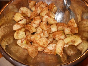 In a large bowl combine pears, apples, orange juice, sugar , flour , cinnamon and vanilla — All the fruit mixture ingredients