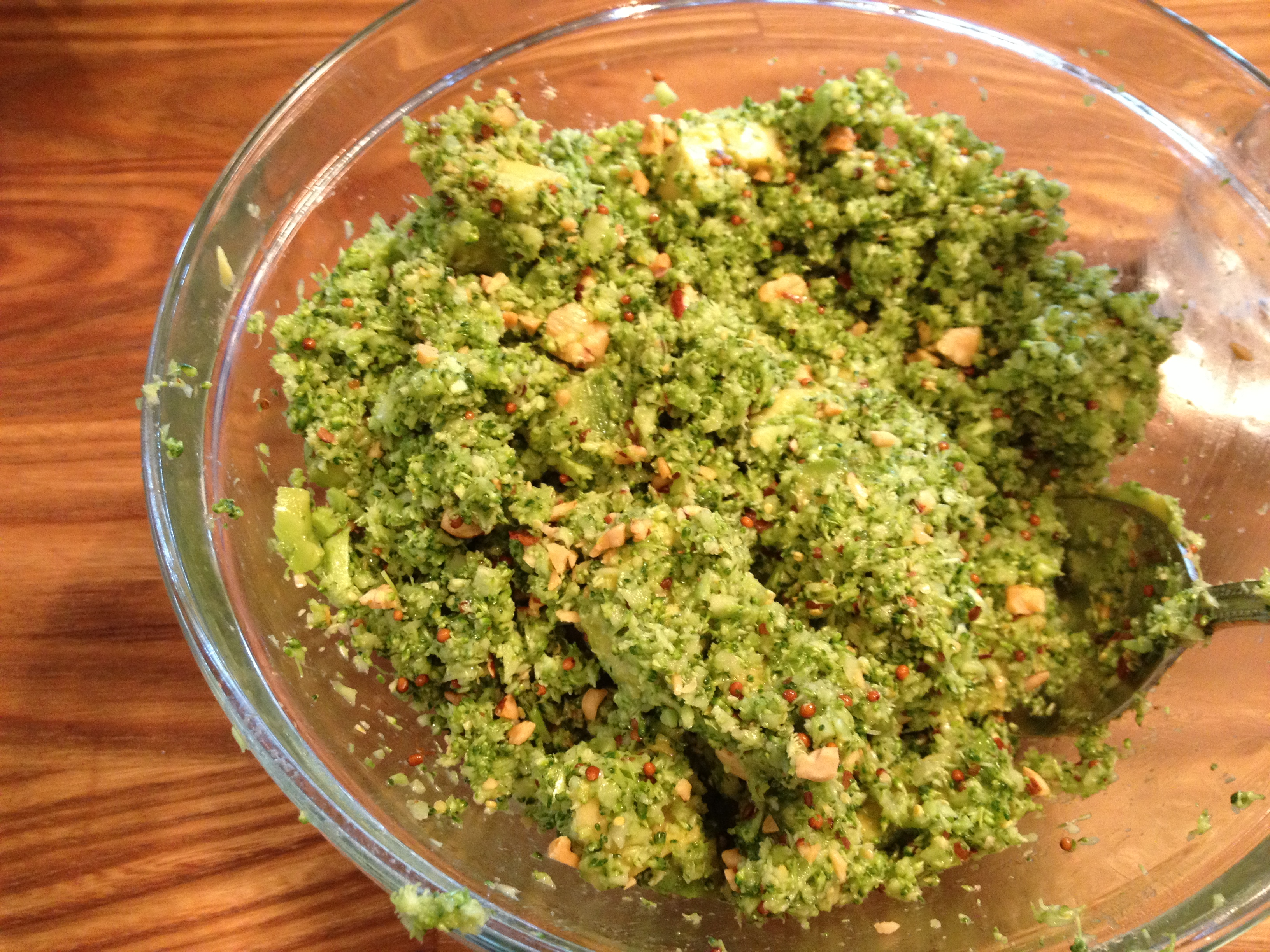 When dressing comes together and has a nice consistency pour over the broccoli give it a good mix and refrigerate. Give it a few mixes during the day and that’s it!