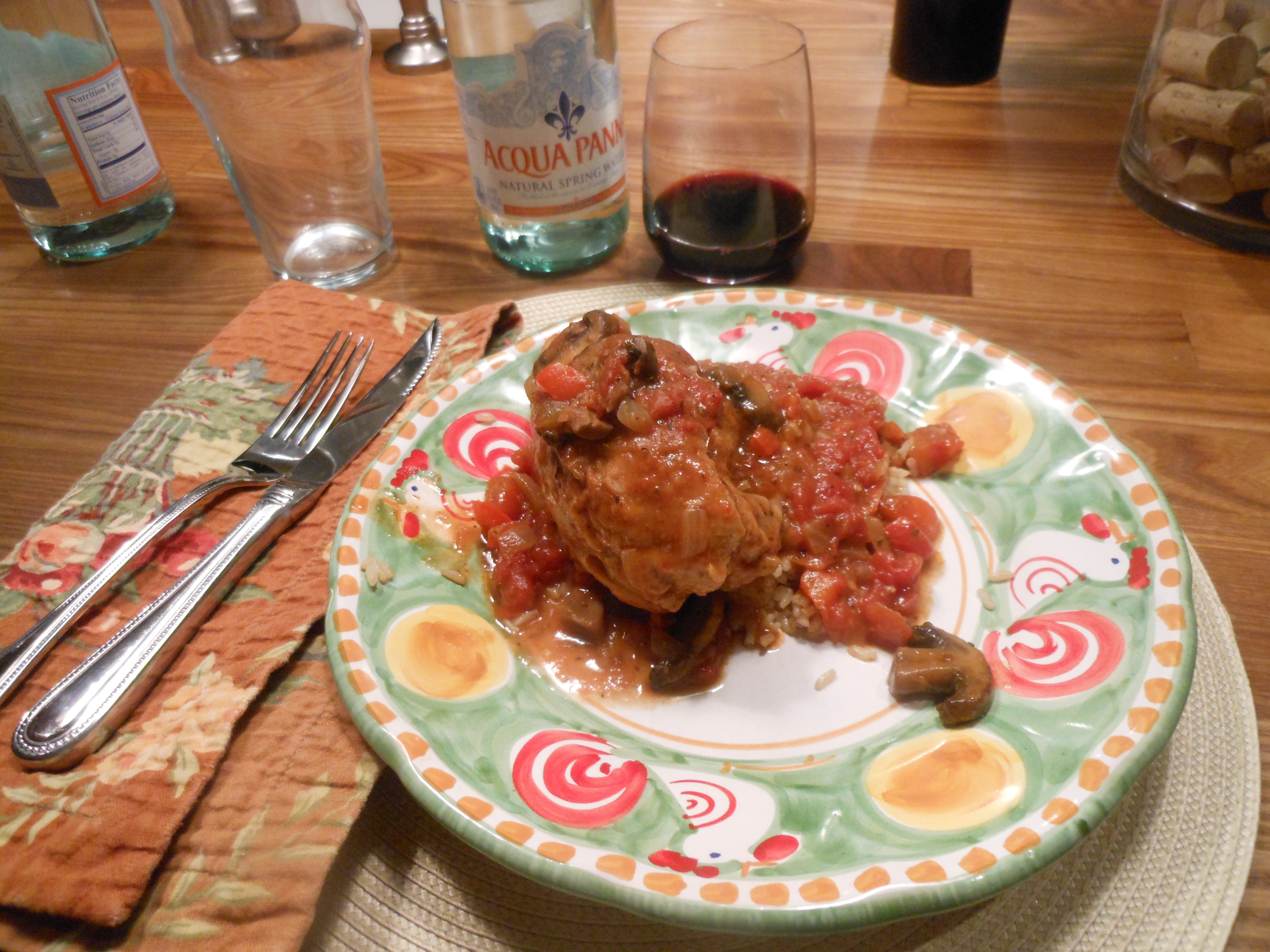 First thing I do is dry all the chicken pieces on paper towels, this will help hold the salt and pepper and make a crackly crust. Sprinkle dried chicken pieces with Salt and Pepper generously. Dredge the chicken pieces in flour to coat lightly. In a large heavy pot ( I used my Le Creuset) heat the oil over a medium-high flame. Add the chicken pieces to the pot and saute till just golden brown, about 5 minutes per side. If all the chicken doesn’t fit , do it in 2 batches, I did thighs and then I did breasts. Transfer the chicken to a plate with tongs and set aside. I have found that it is best if I empty oil out after the chicken and wipe out the pot. I add another 2-3 tablespoons of olive oil and then add the bell pepper, onion and garlic to the same pan and saute over medium heat until the onion is translucent and pepper is soft, about 8 minutes. Then add in mushrooms season with salt and pepper and cook for another five minutes. Add the wine and simmer until reduced by half, about 4 minutes. Add the tomatoes with their juice, broth, and oregano and taste for salt and pepper. Then return the chicken to the pot and turn chicken pieces to coat in the sauce. Bring the sauce to a simmer. Continue to simmer over low-medium heat until the chicken is just cooked through, at least 30 minutes, I cooked for 40, and chicken was perfect.
