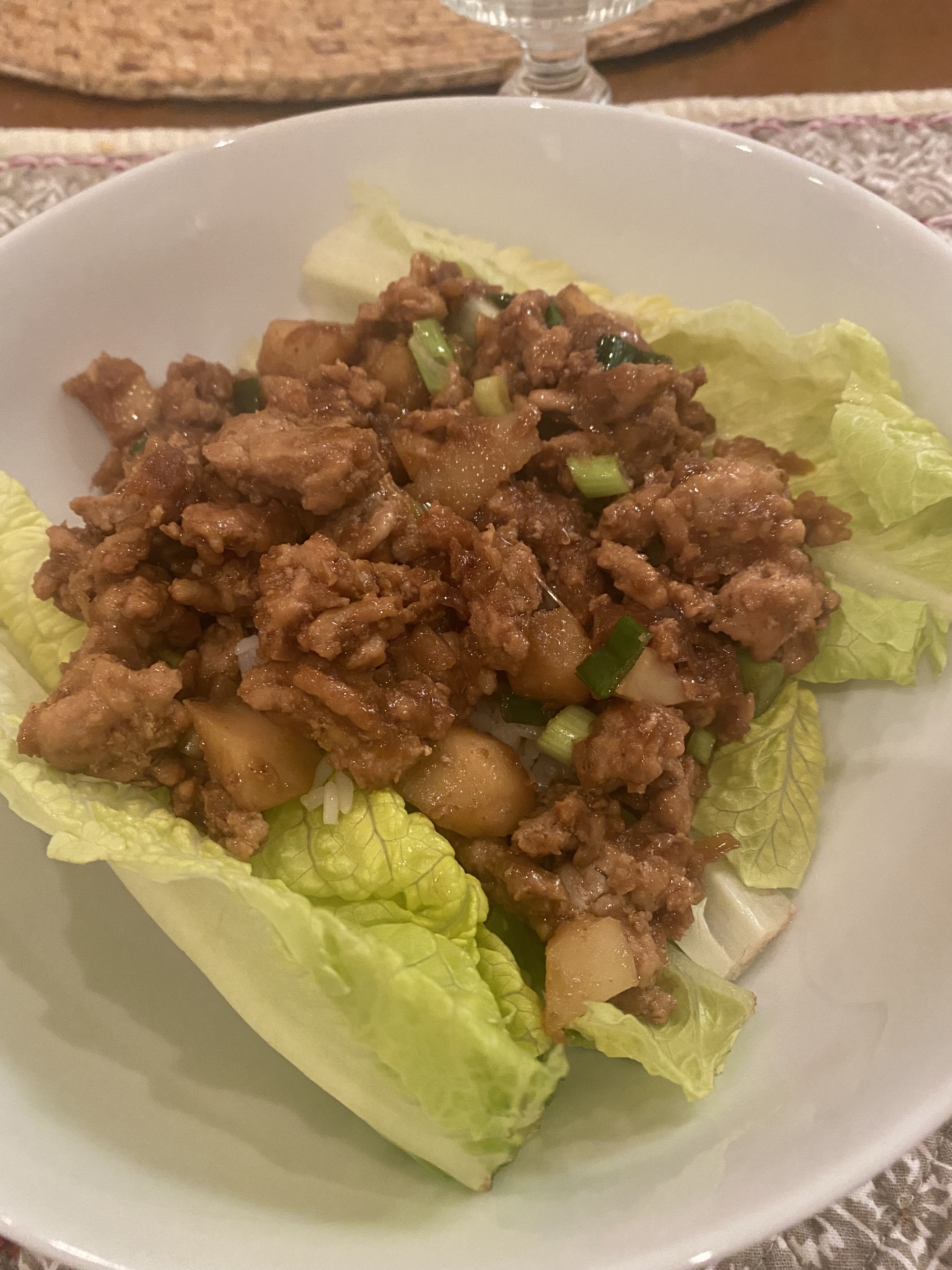 I like my chicken lettuce wraps in a bowl with lettuce , some rice and some Sriracha sauce. ( see pic of last nights dinner)