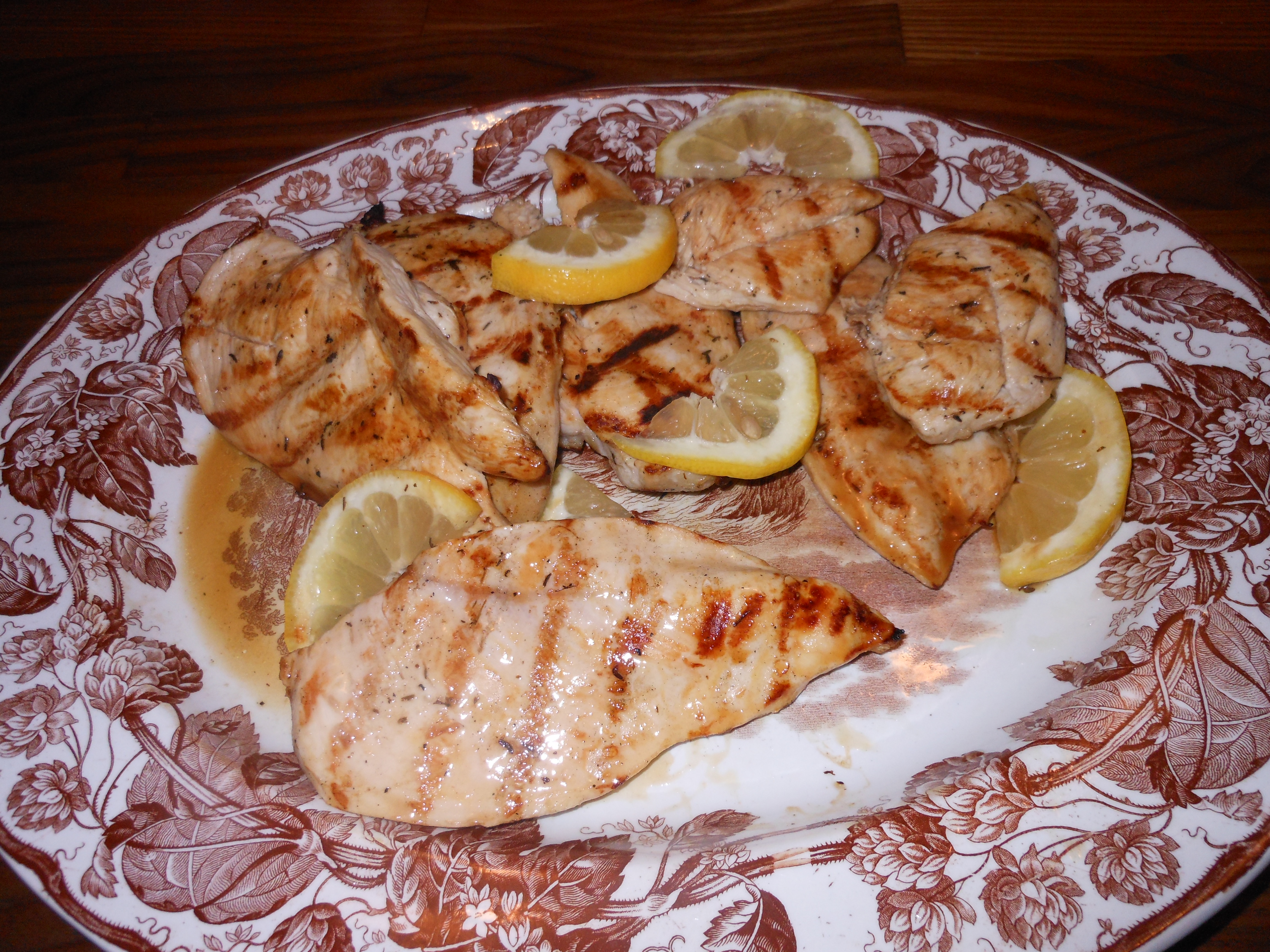 In a small bowl , add chopped garlic, chopped thyme along with lemon juice, oil, salt, red and black pepper. Whisk all ingredients together. Rinse the chicken and pat dry with paper towels.