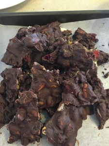 Place chips in microwave safe bowl and heat for app. 2 1/2 minutes. Check frequently as microwaves can vary. 2  – 2 1/2 minutes was sufficient. Once the chocolate is smooth and creamy, add the rest of the ingredients into the bowl and stir until combined. Make certain your bowl is large enough to accommodate the chocolate and dry ingredients.